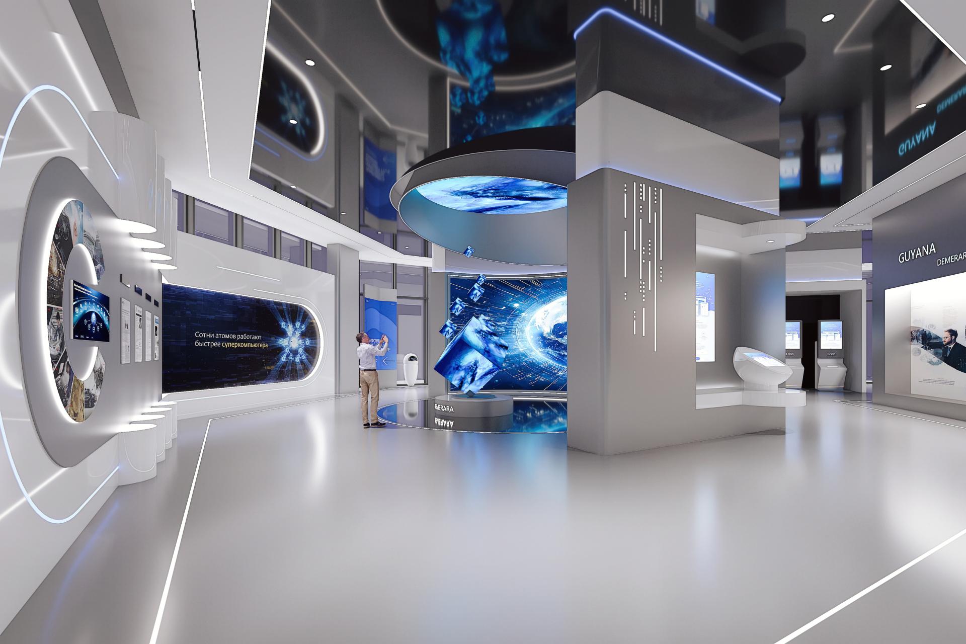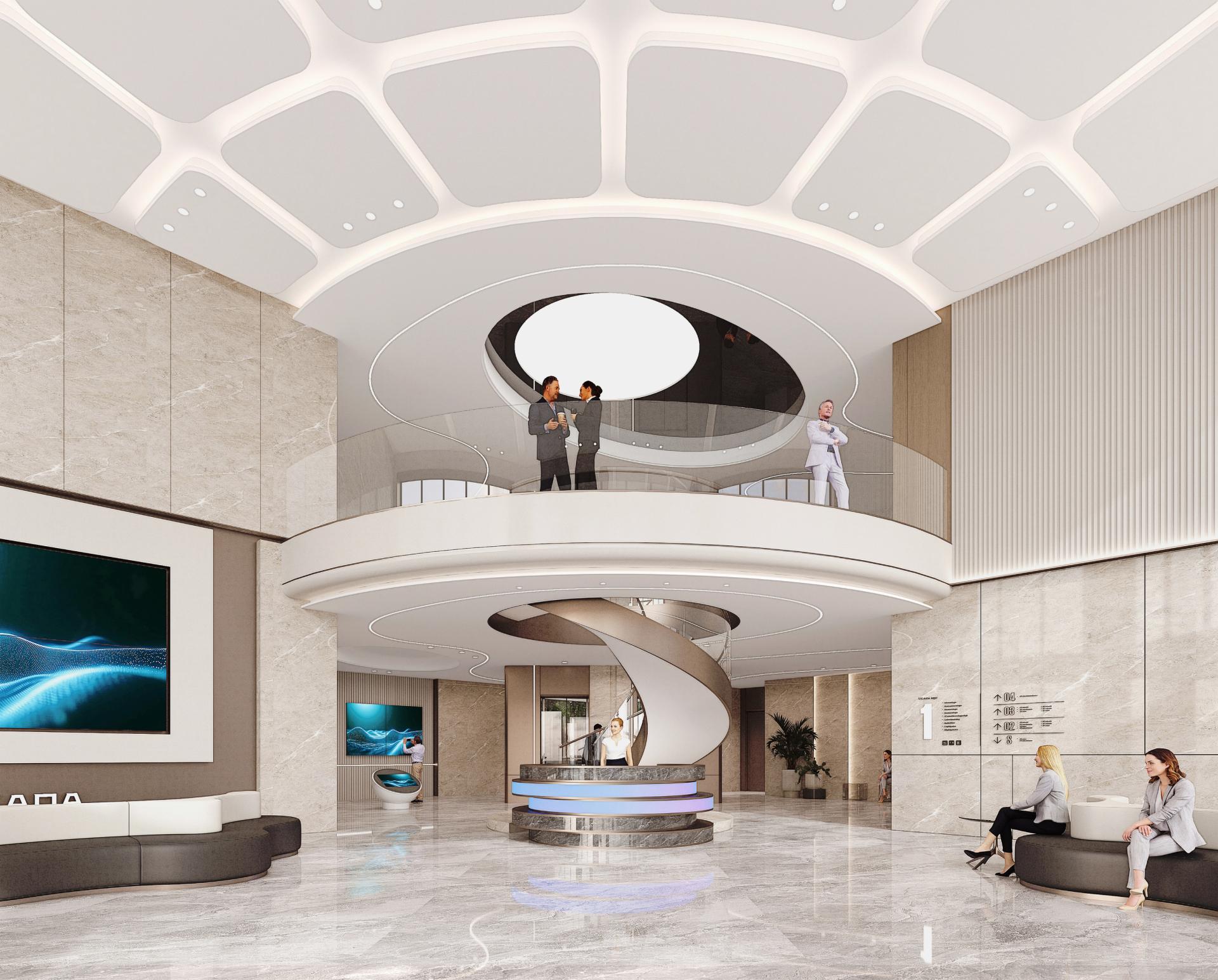 The interior design is guided by the idea of "human-centered financial services". The digital exhibition hall employs a blue-and-silver palette and floating digital interfaces to create an immersive, future-oriented financial experience. The main entrance lobby combines warm natural stone with fluid spatial forms to establish a transparent, luminous, and refined business atmosphere, redefining the emotional and experiential quality of contemporary financial spaces.
