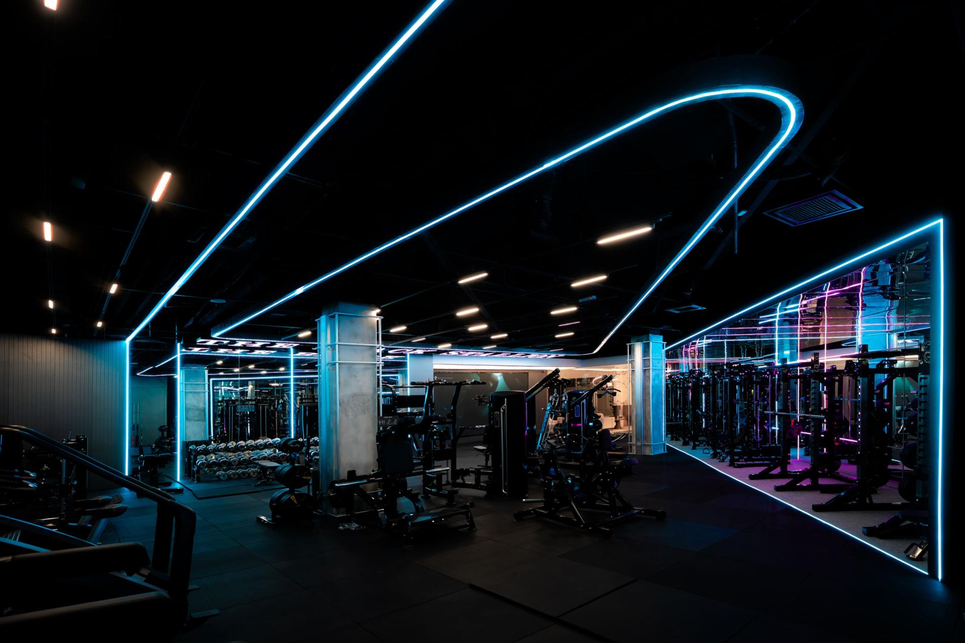 A dark material palette, metallic finishes, and mirrored surfaces create a strong and immersive atmosphere. Purple and blue LED light lines define movement throughout the gym, guiding circulation while reinforcing a sense of rhythm and control. The entrance tunnel to the Focus Studio marks a clear transition, leading users from the outside world into a concentrated state of mind.