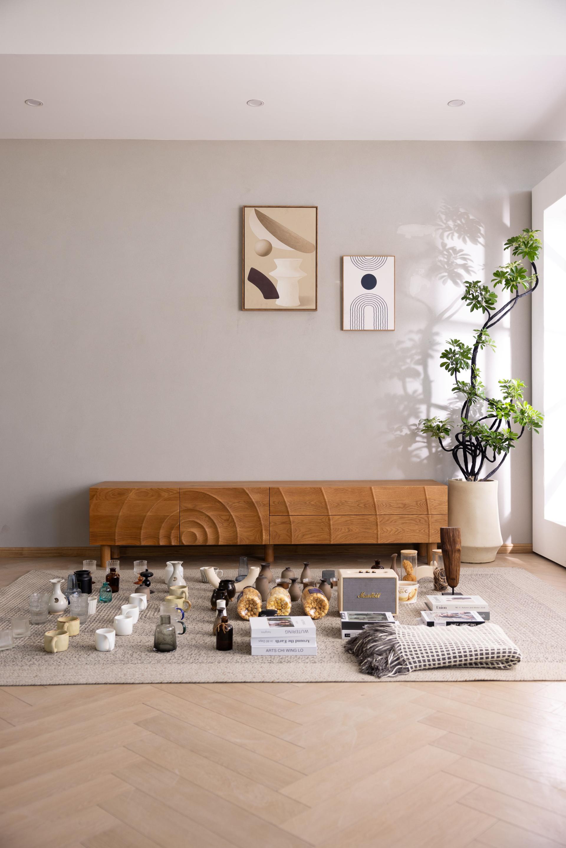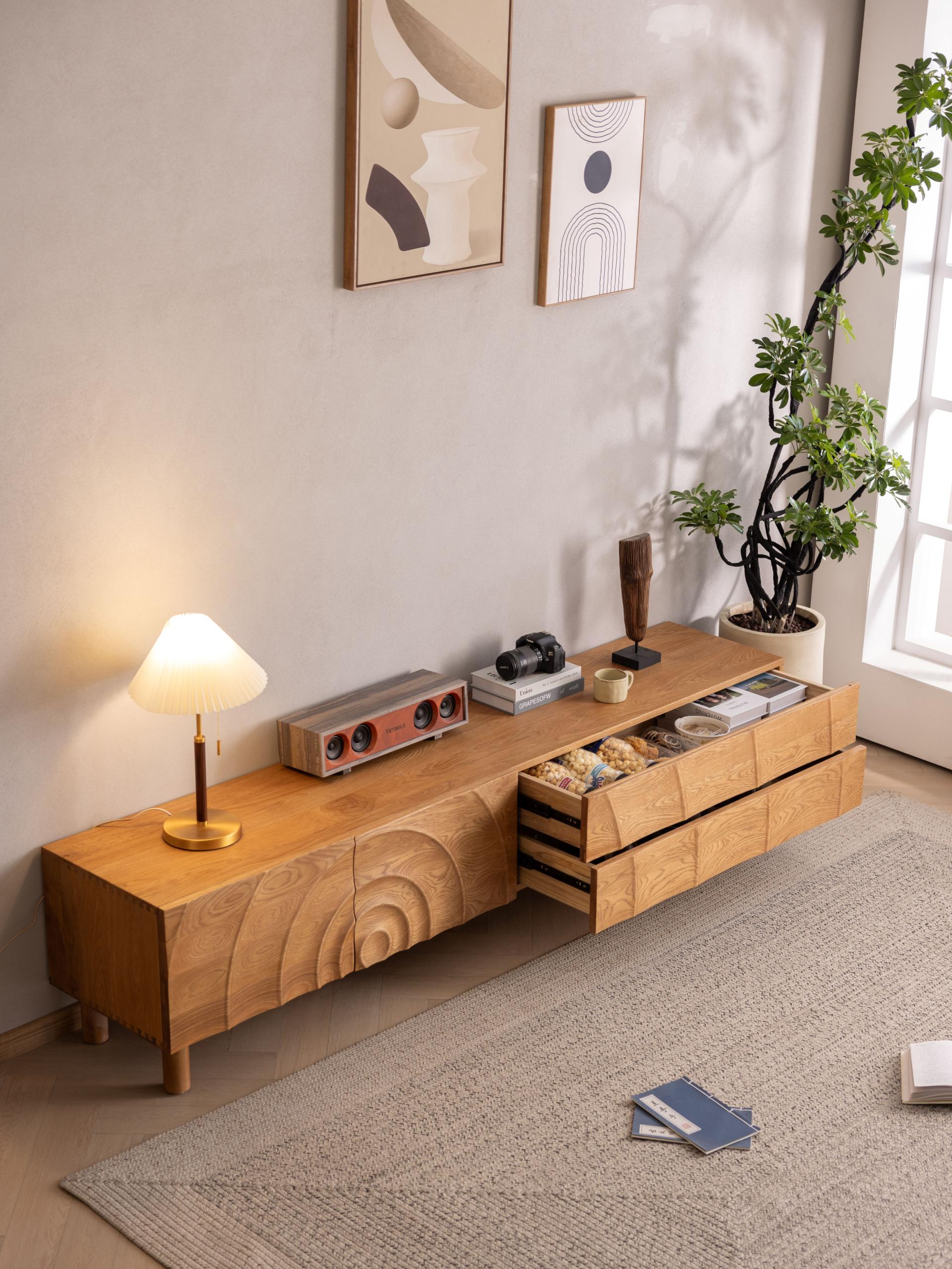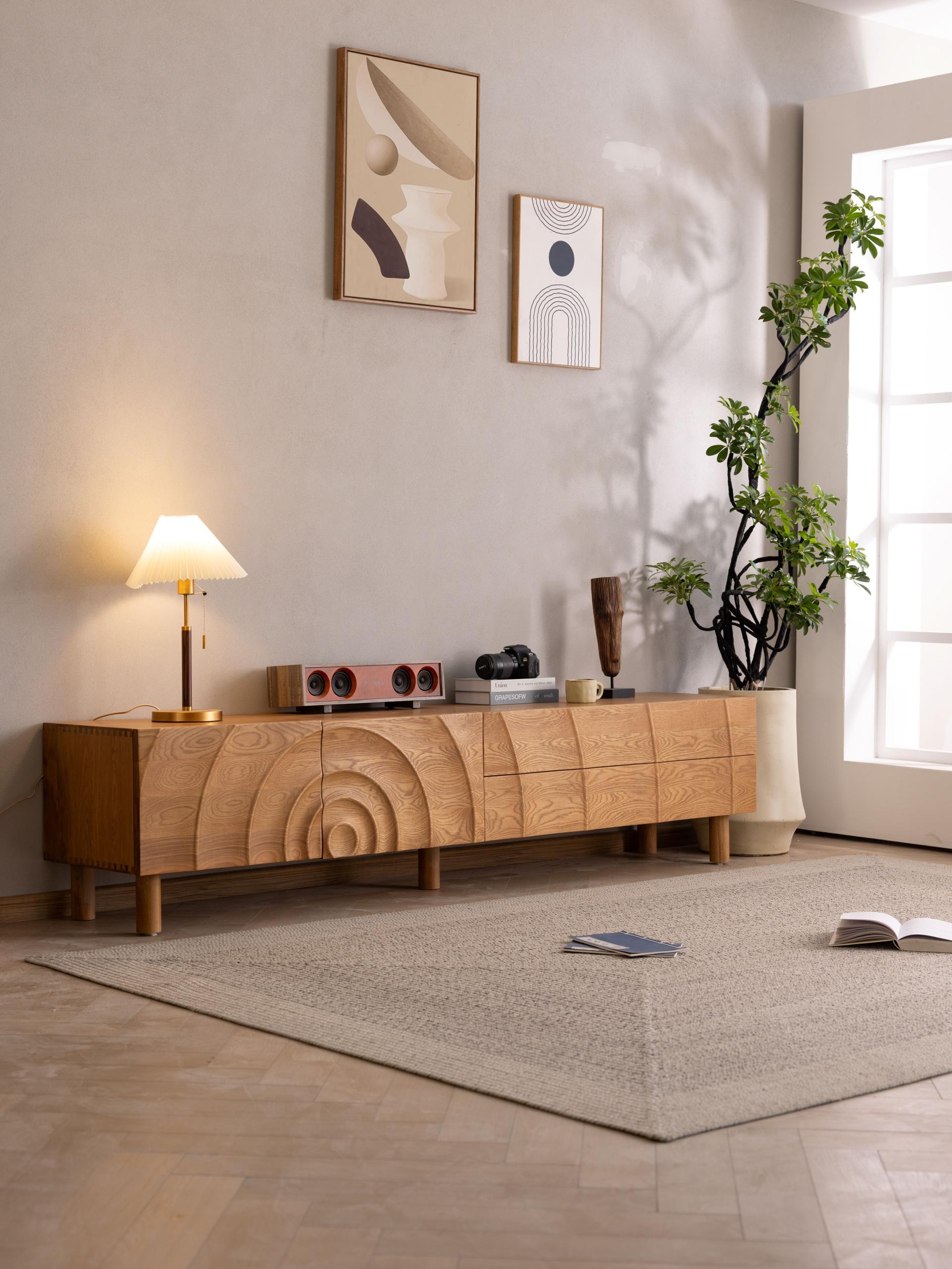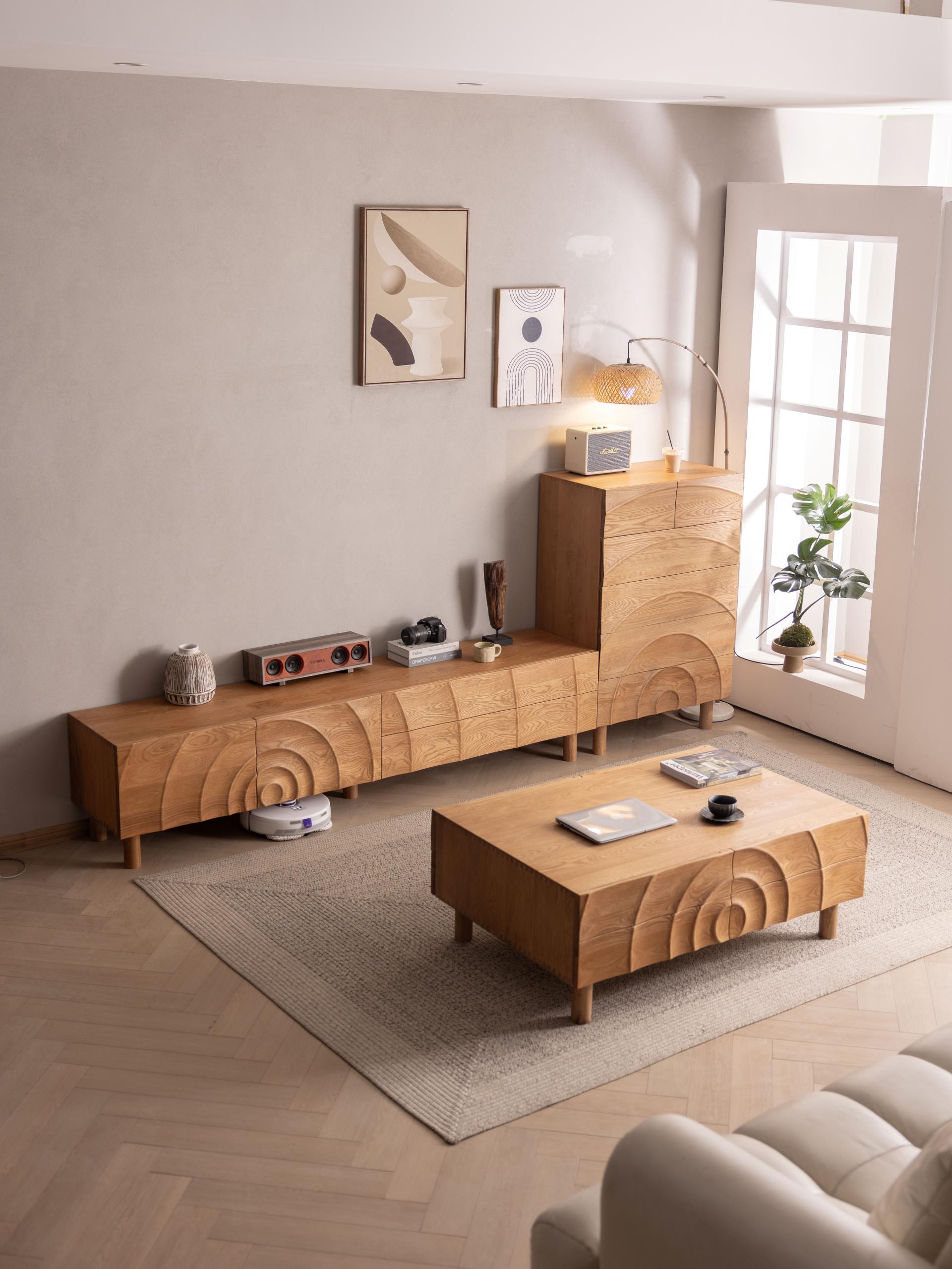 The Ripple TV Cabinet is a solid wood furniture piece designed around the concept of home aesthetics and natural craftsmanship. Inspired by the gentle movement of water ripples, the cabinet features a sculpted wave-like texture on its front panels, transforming an everyday storage unit into a visually expressive element within the living space. By combining artistic wood carving with functional storage design, the product creates a harmonious balance between practicality and aesthetic refinement.