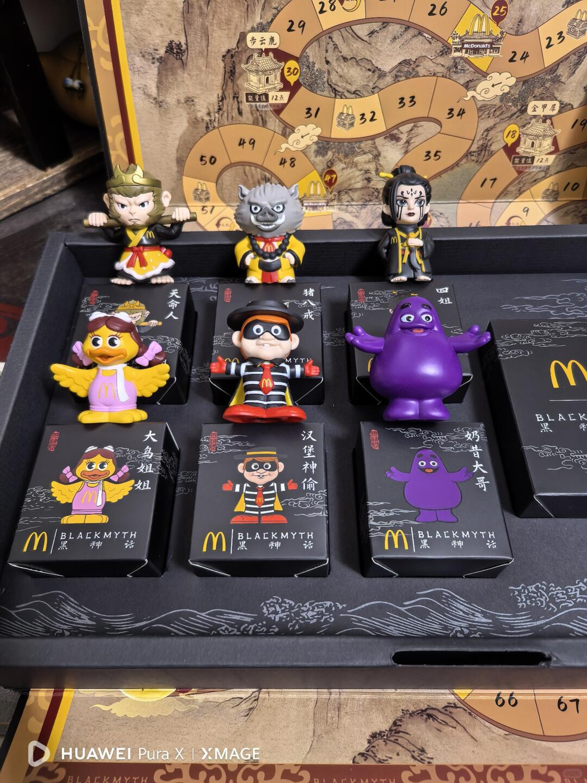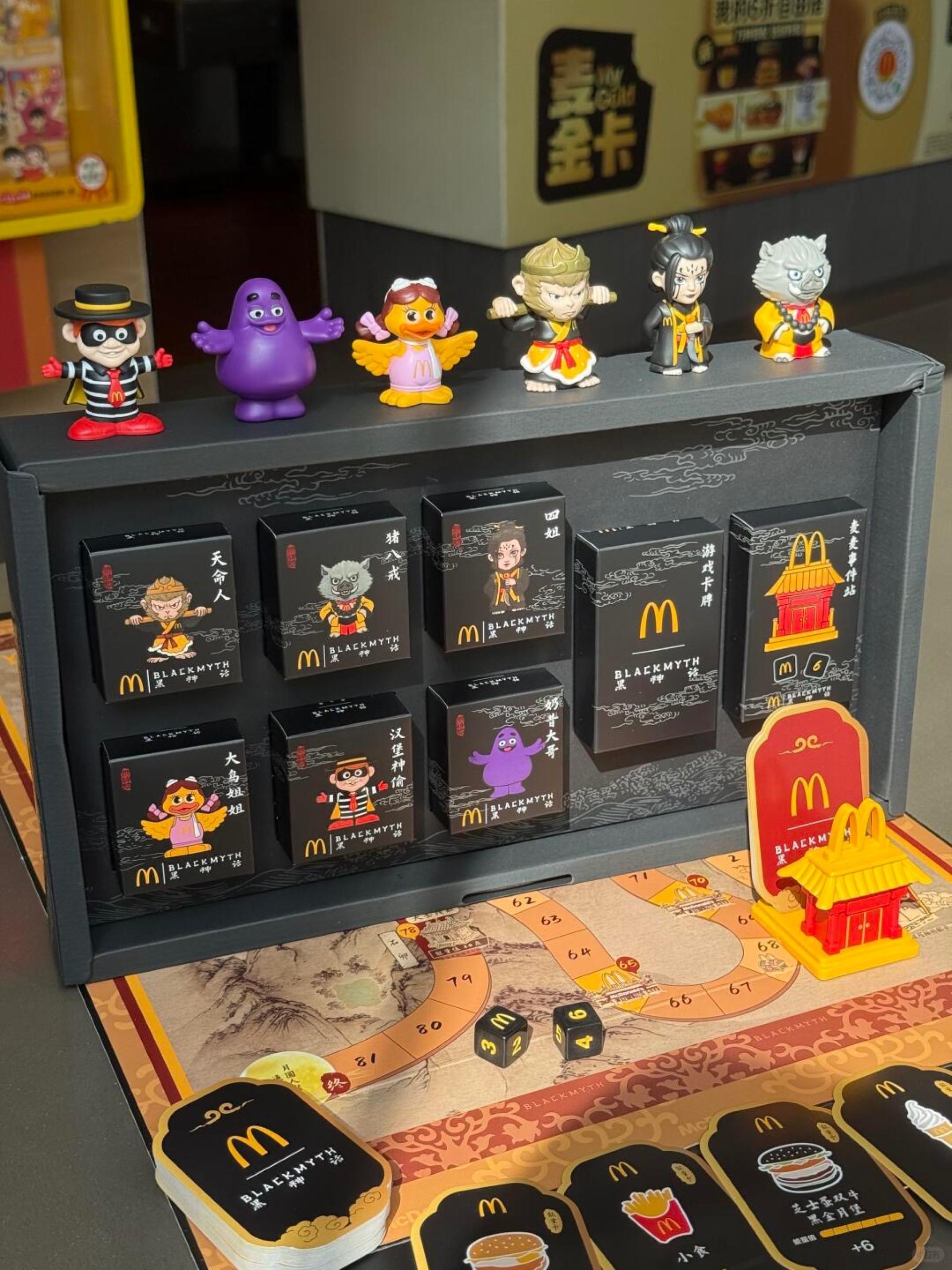 A highlight of the set is the collection of six collectible blind-box figurine pawns (50–64 mm PVC). These include beloved characters from Black Myth: Wukong—such as the Destined One, Zhu Bajie, Fourth Sister and other mythological figures—alongside McDonald’s classic mascots like the Hamburglar, Grimace, and Birdie. Each character comes with a unique hidden ability that can shift the course of the game.