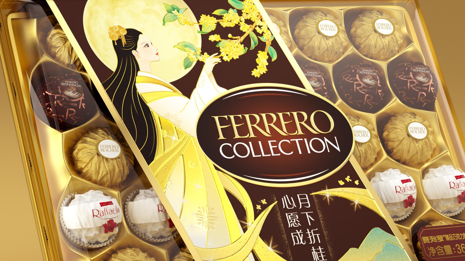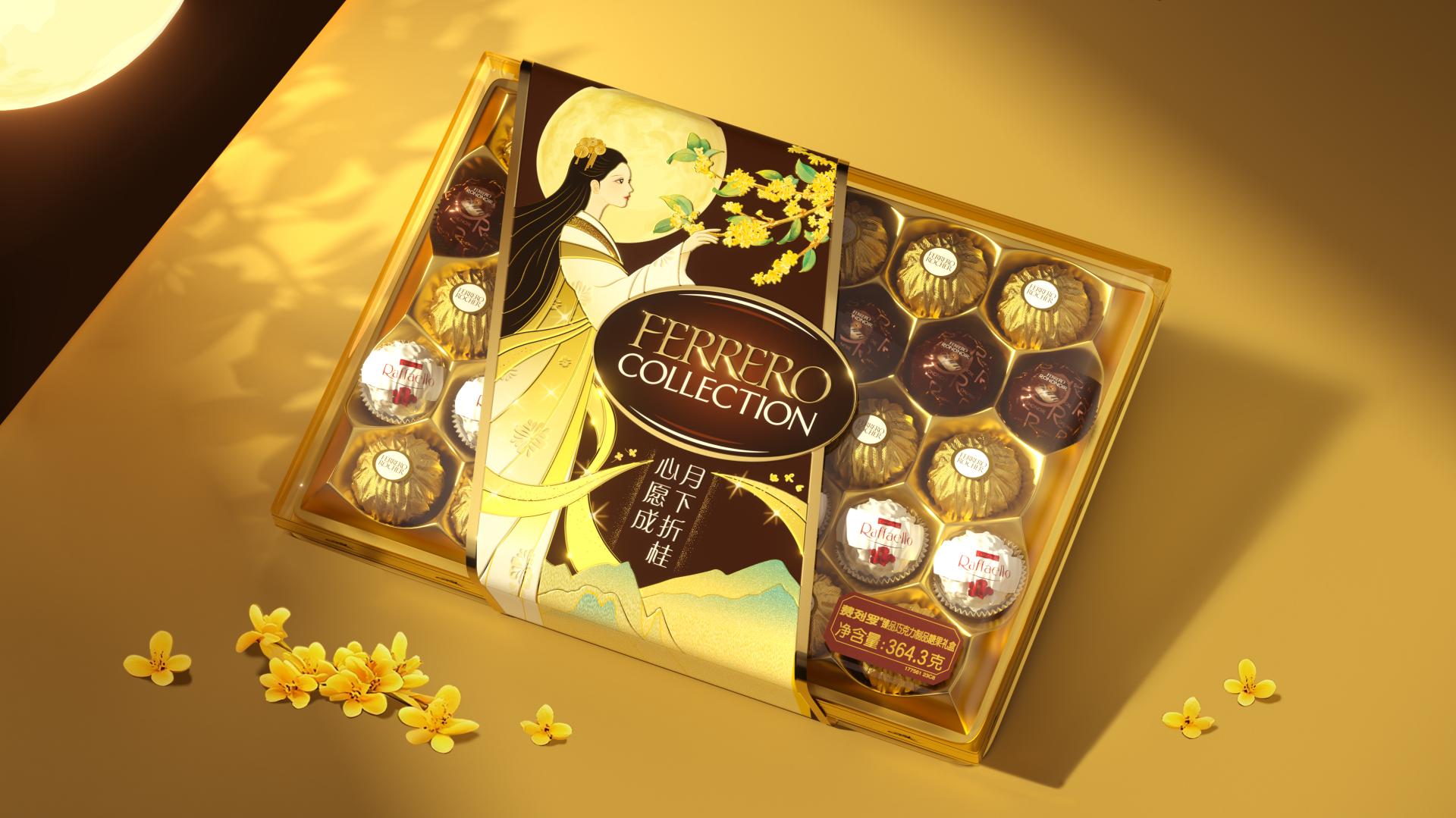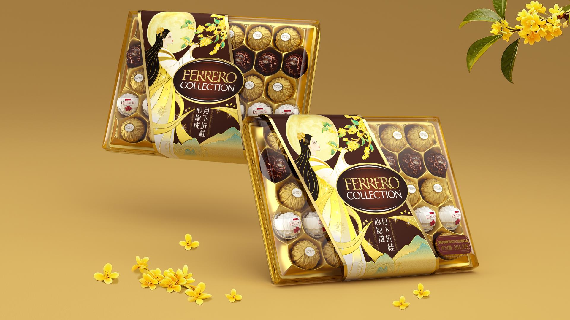 The Mid-Autumn Festival sleeve design transforms the myth into a vivid scene of “Chan Gong Zhe Gui”. An elegant girl dressed in golden-tinged Hanfu stands beneath the full moon, gently reaching for a laurel branch, complemented by the round full moon and golden laurel blossoms. It retains Ferrero’s signature luxurious texture while infusing the packaging with strong festive warmth through the refined elegance of traditional Chinese realistic painting— breathing new life into classic folklore through modern design.