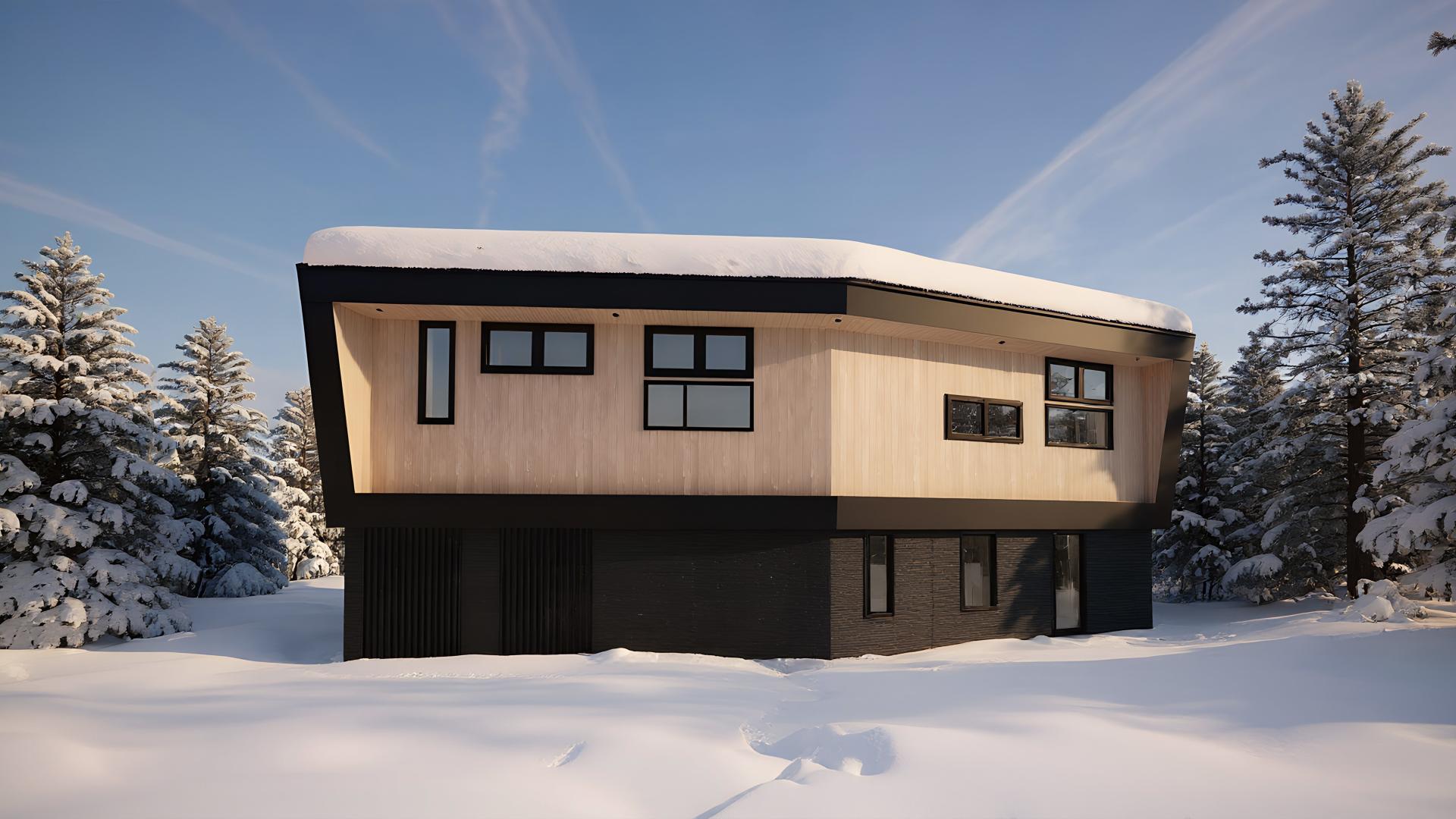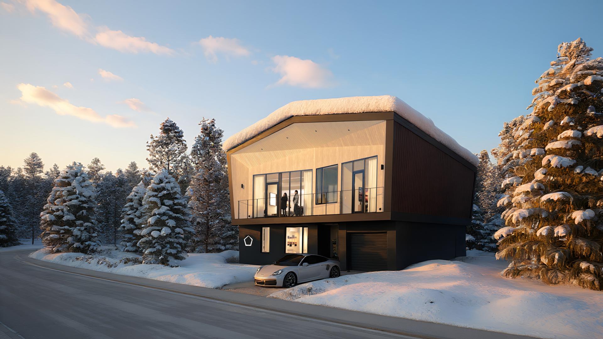 Conceived as a contemporary alpine residence, the architecture responds directly to its climate, surroundings, and distant vistas. Rather than a conventional orthogonal layout, the building adopts a pentagonal plan that simultaneously orients the interior toward Mount Yotei and the town of Kutchan while maintaining privacy and compact circulation. The geometry is expressed both horizontally through the balcony and cantilevered roof, and vertically through a continuous metal outline framing the glazed upper façade.