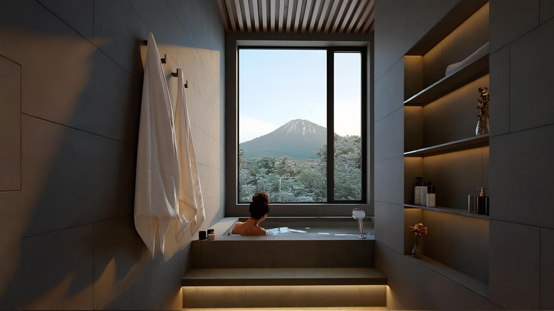 Between them, a traditional tiled Japanese bath faces a framed mountain view, creating a quiet restorative retreat after skiing.