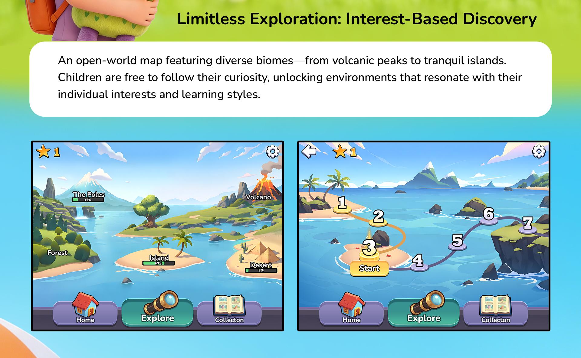 Children explore diverse biomes, such as islands or volcanoes, solving challenges to rescue animals. In return, grateful animals share educational "fun facts" and keepsakes for the child’s digital room. A dedicated Collection page allows children to revisit their impact. To ensure a healthy digital-physical balance, when screen time ends, an AI-powered IoT plush companion takes over, offering personalized stories and quizzes based on the child’s favorite in-game moments.