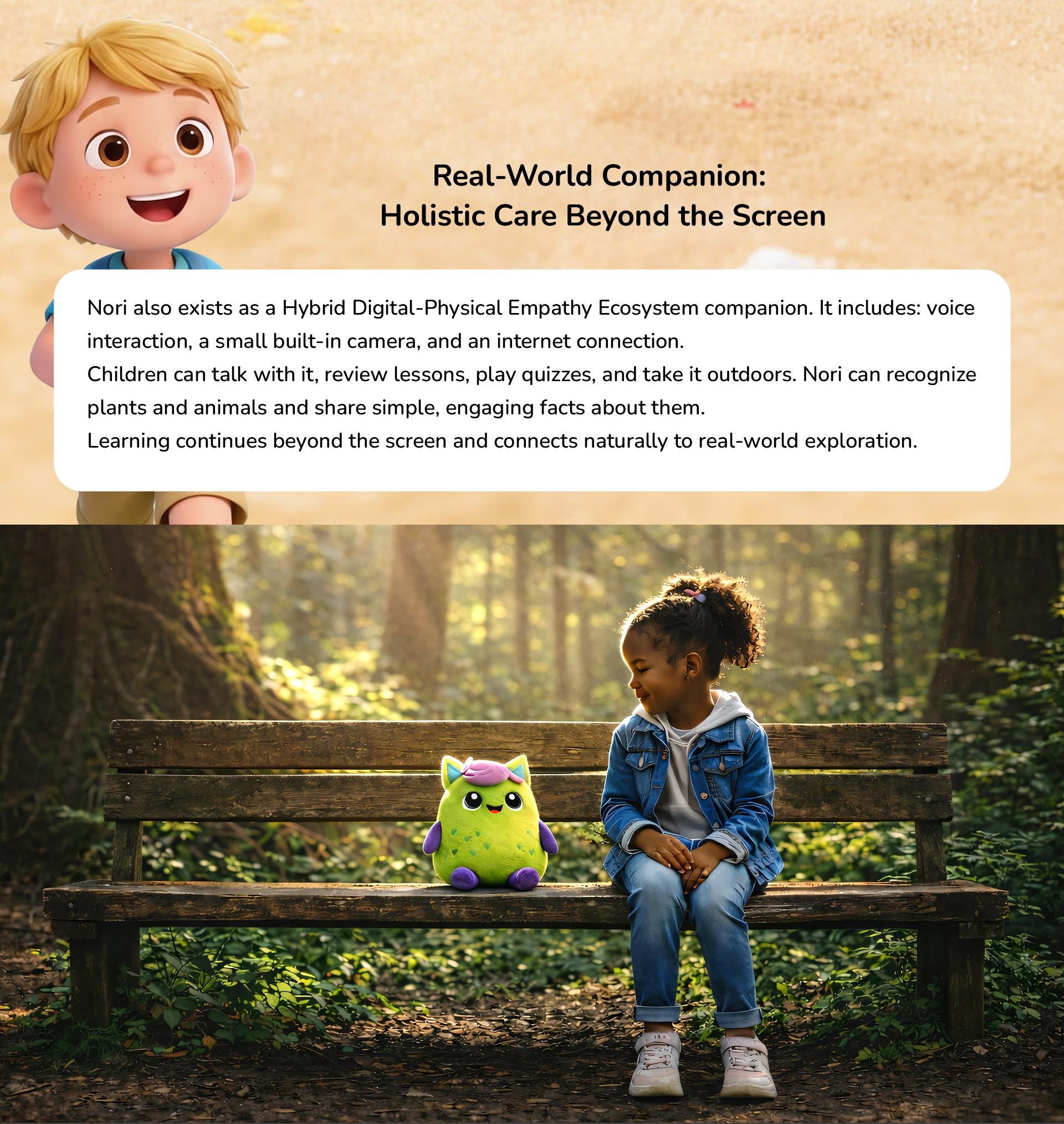 Nori is an empathy-driven adaptive educational game that cultivates intrinsic motivation by reframing learning as an act of care. Instead of chasing scores, children help and protect animals within a narrative world. Globally, this addresses an urgent need for the 20% of children with neurodivergent traits, including approximately 160–380 million with dyslexia and 85–130 million with ADHD. By integrating academic subjects—math, spelling, and science—into a unified emotional framework, Nori supports diverse learning needs through a barrier-free, inclusive UX.