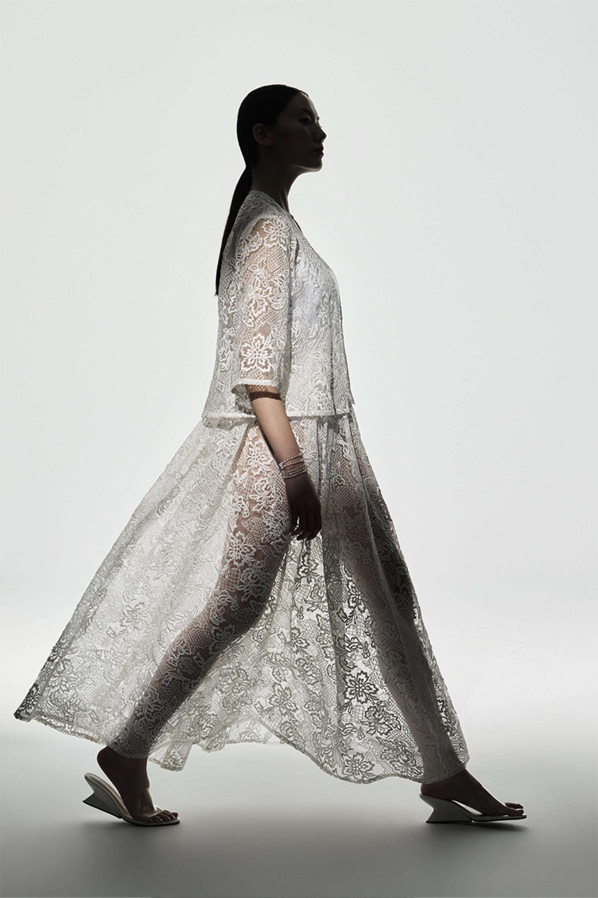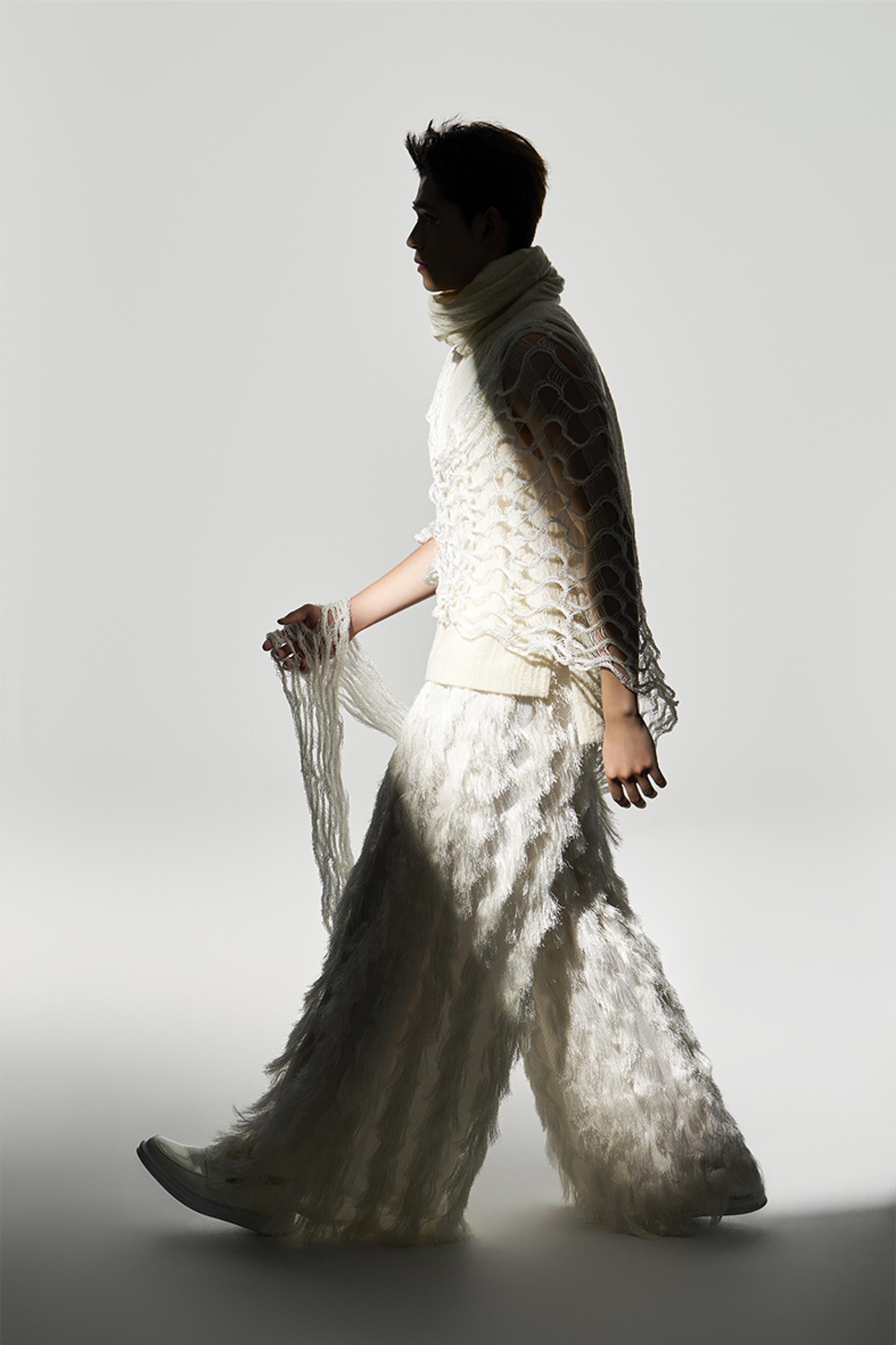 The collection is created using recycled and reusable materials, emphasizing a circular approach to fashion design. Discarded fishing nets, recycled plastics, and transparent biodegradable materials are reinterpreted to construct lightweight rainwear. The translucent surfaces echo the visual rhythm of falling rain and drifting mist, allowing the garments to capture the poetic atmosphere of rain-soaked streets while demonstrating the aesthetic potential of reclaimed materials.