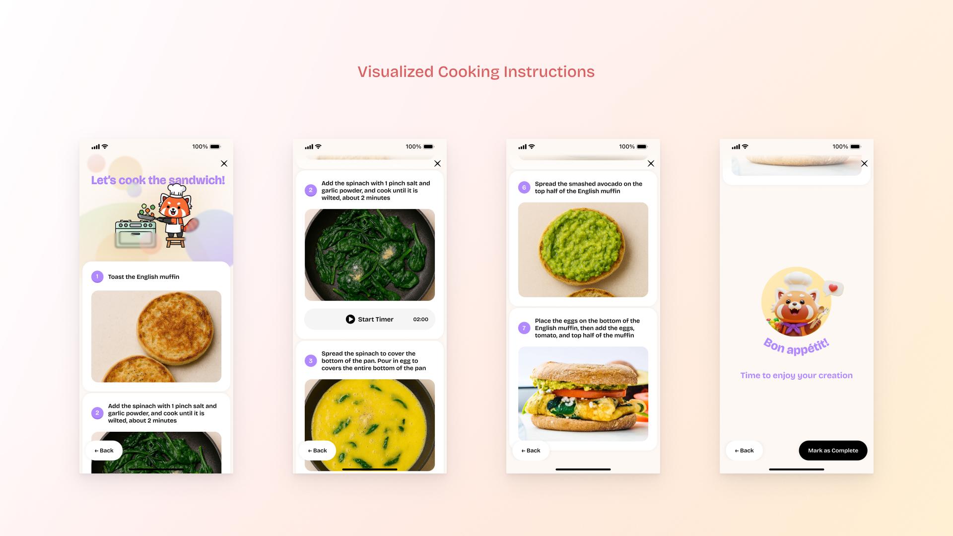 HappyPan transforms traditional written cooking steps into clear visual guides. By leveraging text-to-image AI technologies, the app converts verbose, ambiguous recipe descriptions into step-by-step visual instructions. This allows users to quickly understand what each step should look like, eliminating uncertainty and significantly lowering the barrier to cooking for users with little or no kitchen experience. The visual format also aligns with the fast-scrolling, tl;dr content consumption patterns common among younger audiences.