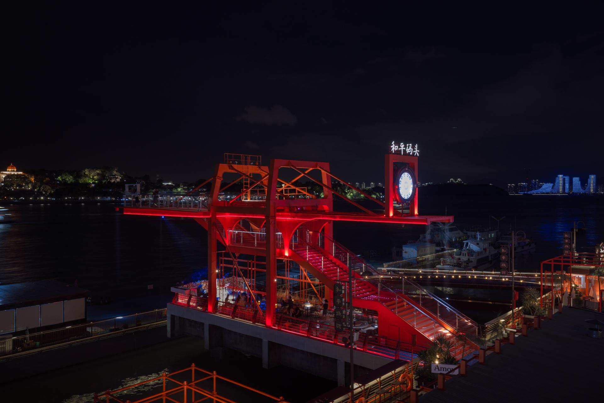 The gantry crane at Heping Wharf stands as a living specimen of Xiamen's shipping history. It has witnessed countless moments—lifting containers and enduring the daily hustle of dock workers. As its functional role diminished, the challenge was to transform this industrial relic into an urban memory anchor. The lighting design aimed to connect the past with the present, using light as the medium to highlight the traces of time etched into the rusted steel.