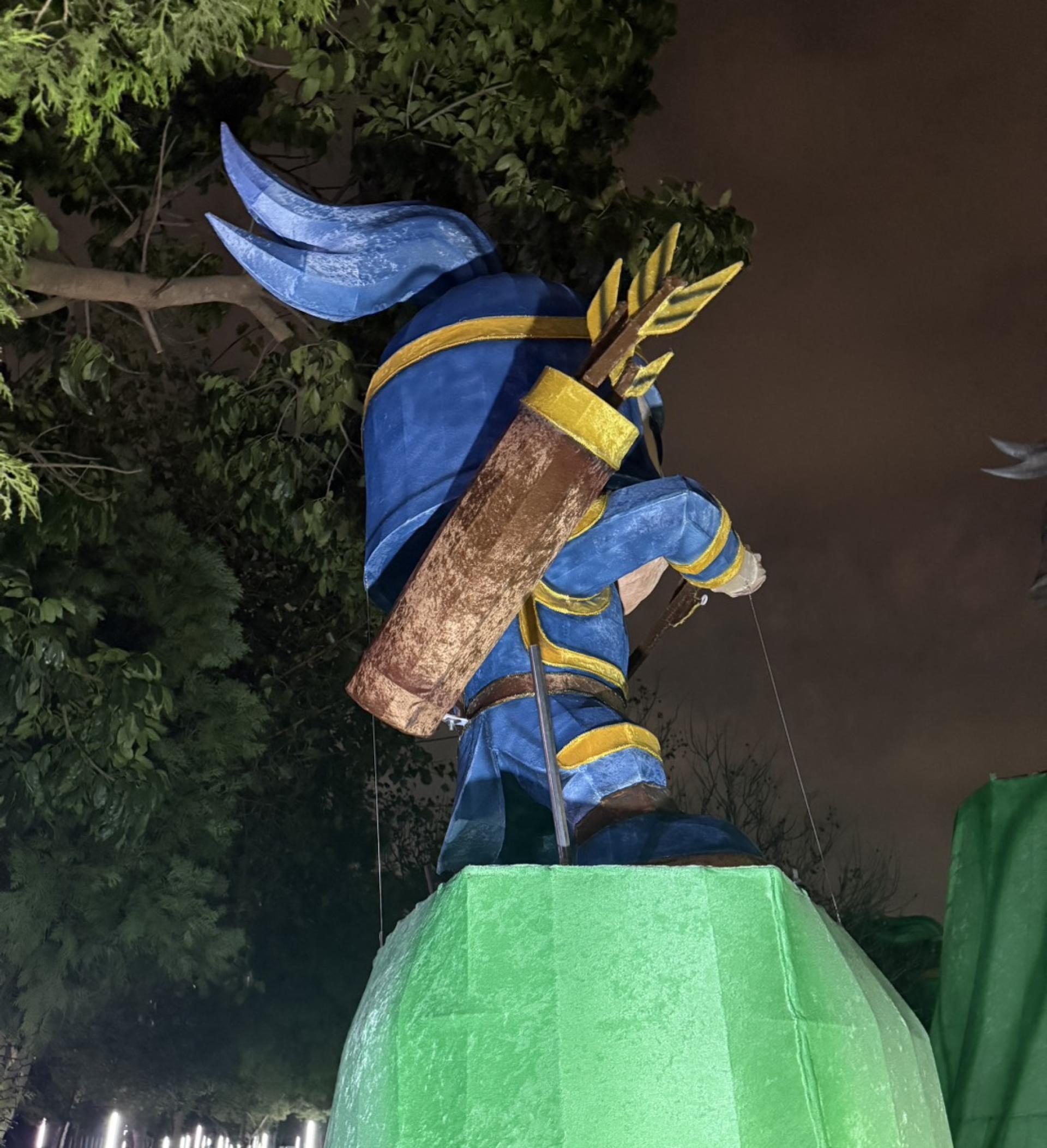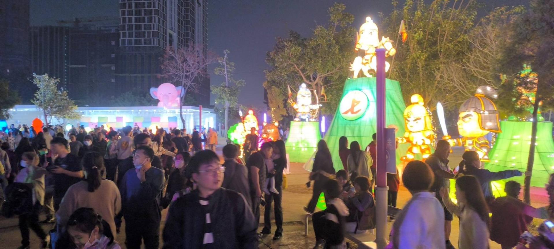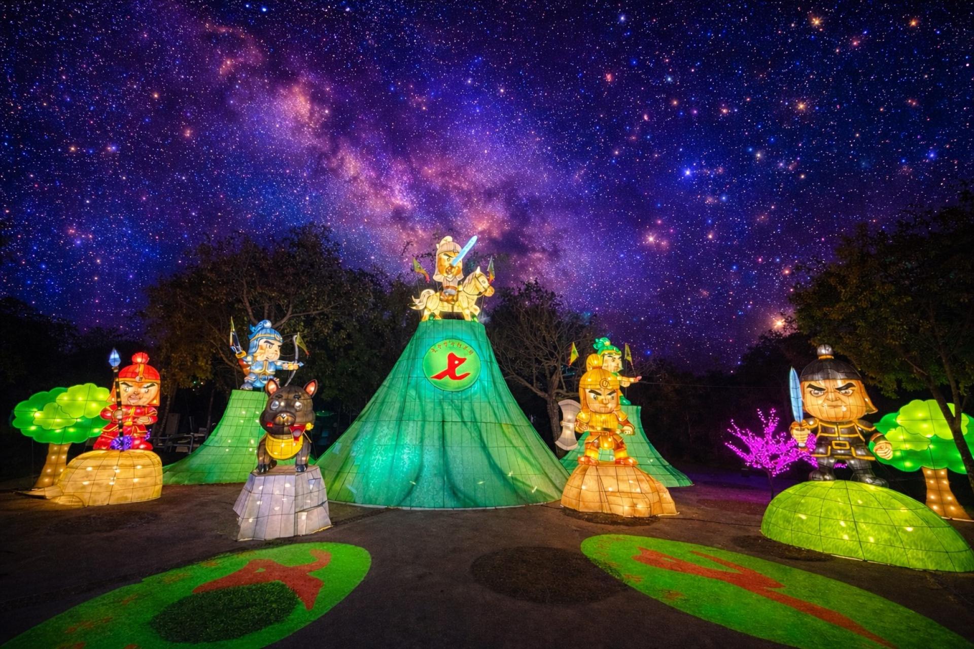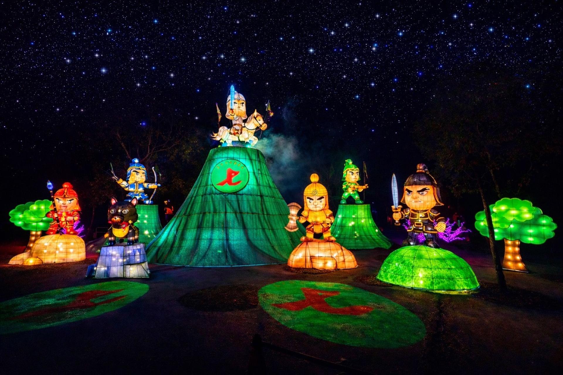 The installation combines large illuminated lantern sculptures with a dramatic nighttime lighting atmosphere, creating a powerful visual centerpiece for the festival environment. During the day, the vibrant colors and ceremonial designs highlight the cultural heritage of the figures. At night, the lighting system enhances the sculptural forms and creates an immersive themed lighting experience.