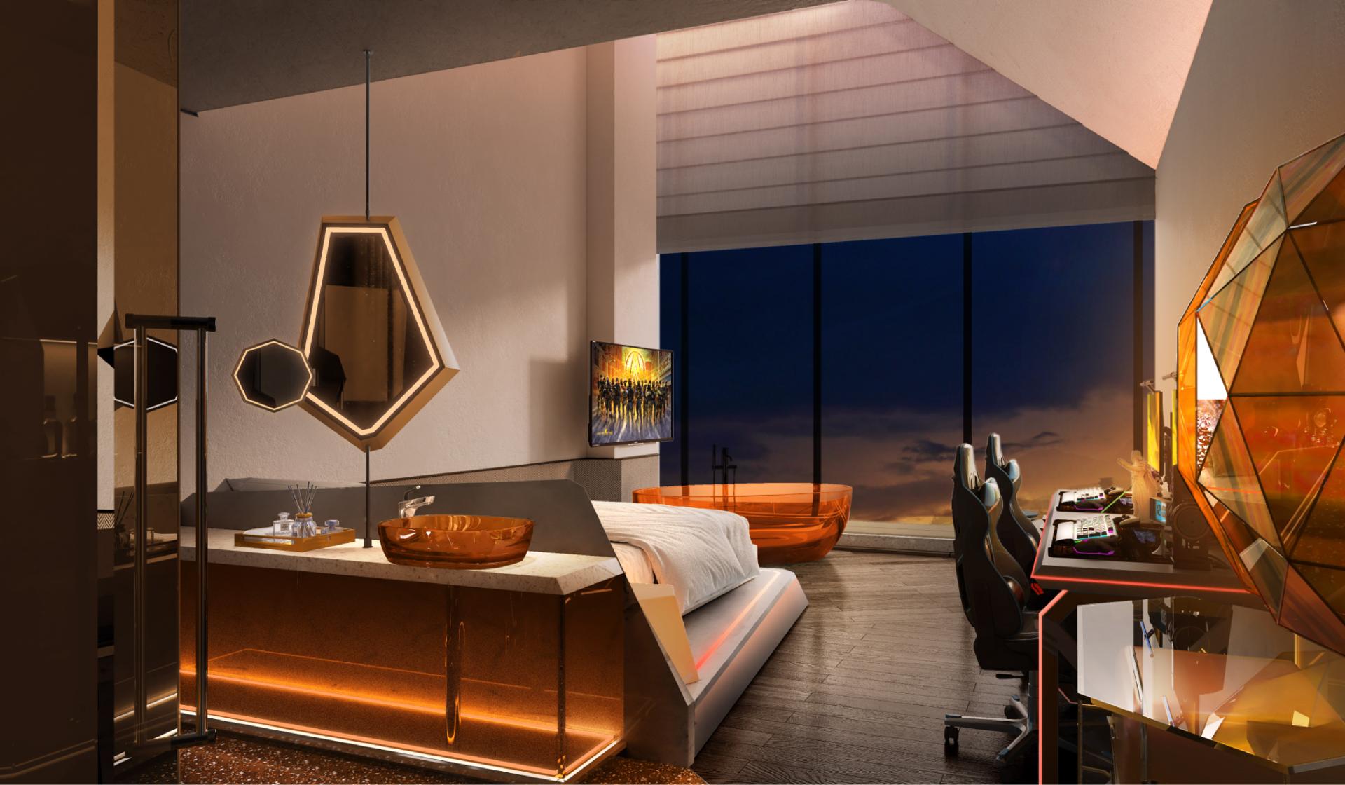 High-saturation color schemes and layered lighting systems establish a multi-sensory experience. The gaming arena features bold contrasts of gold, red, and silver, while guest rooms adopt distinct color identities. Indirect lighting and luminous surfaces enhance perception, immersion, and spatial rhythm.