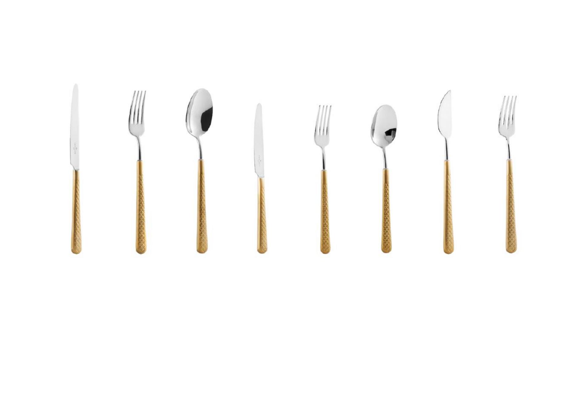 The exclusive design of the Prism cutlery set, with its Diamond motifs and tímeless lines, is inspired by the iconic Bicos Collection, blending crafsmanship and technology in sophisticated finishes in 18/10 tempered stainless steel. The new Prism d’OR Collection adds to the geometric beauty and complex texture of Prism with gold finishes that give it a superior refinement.