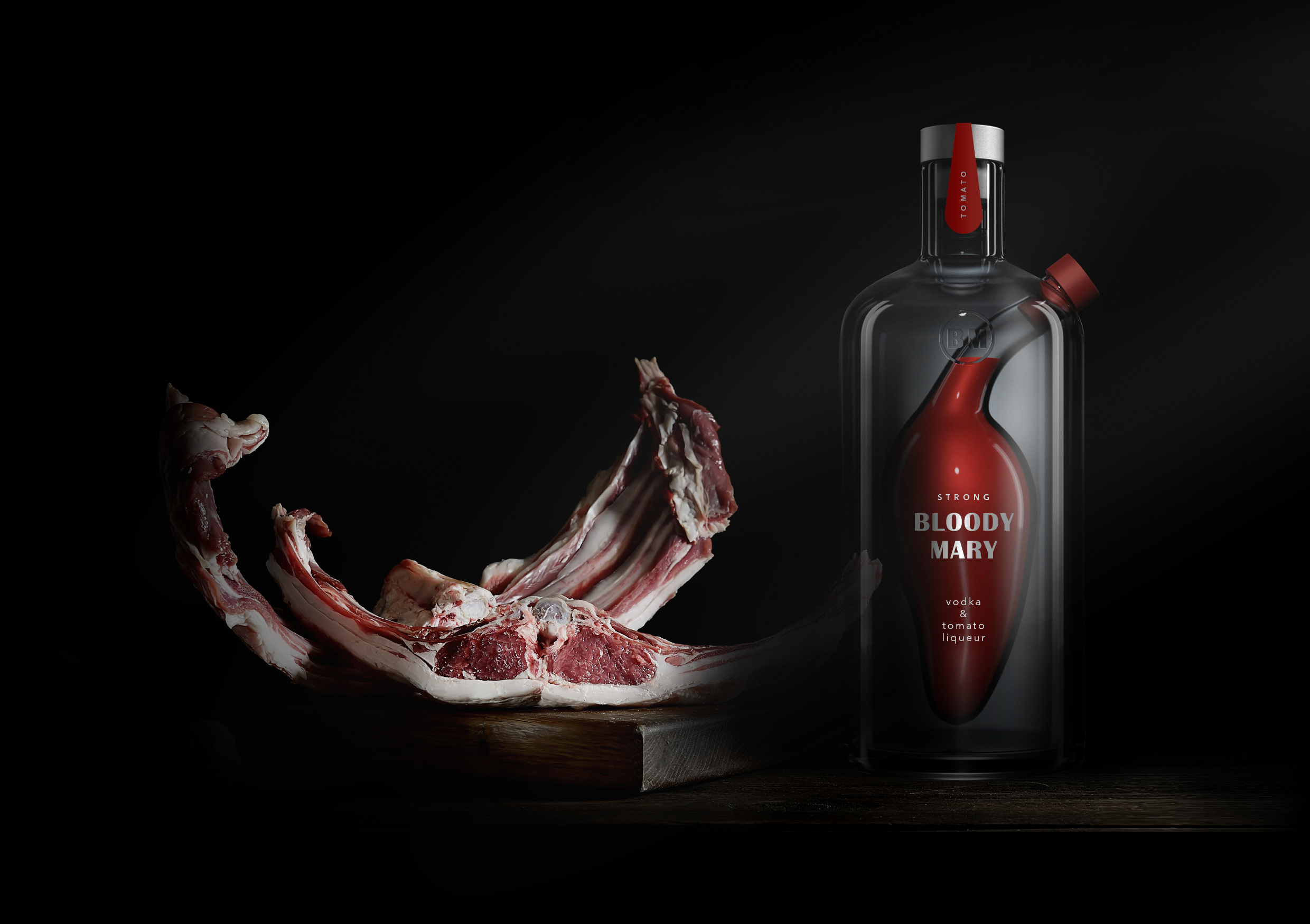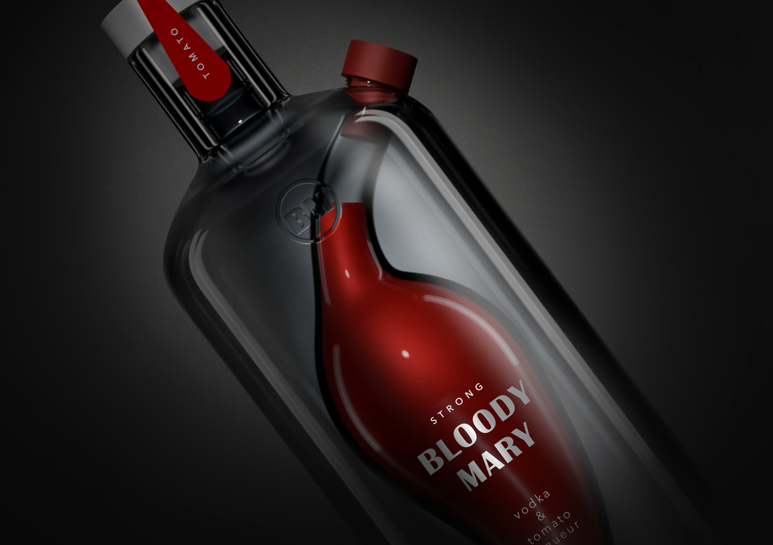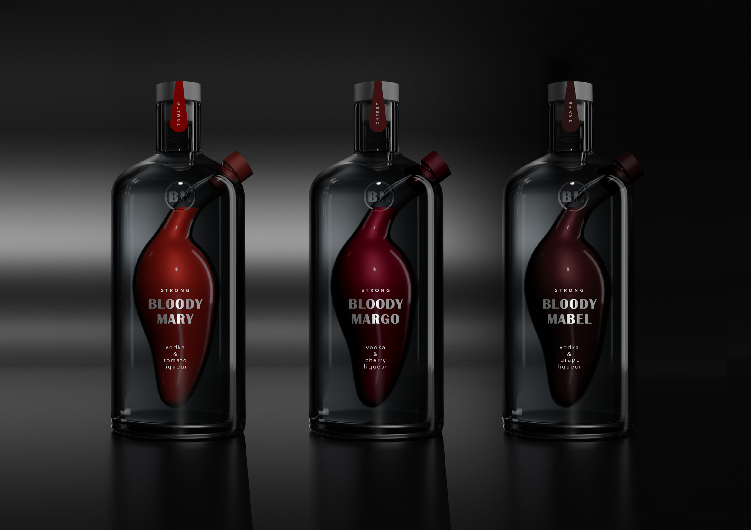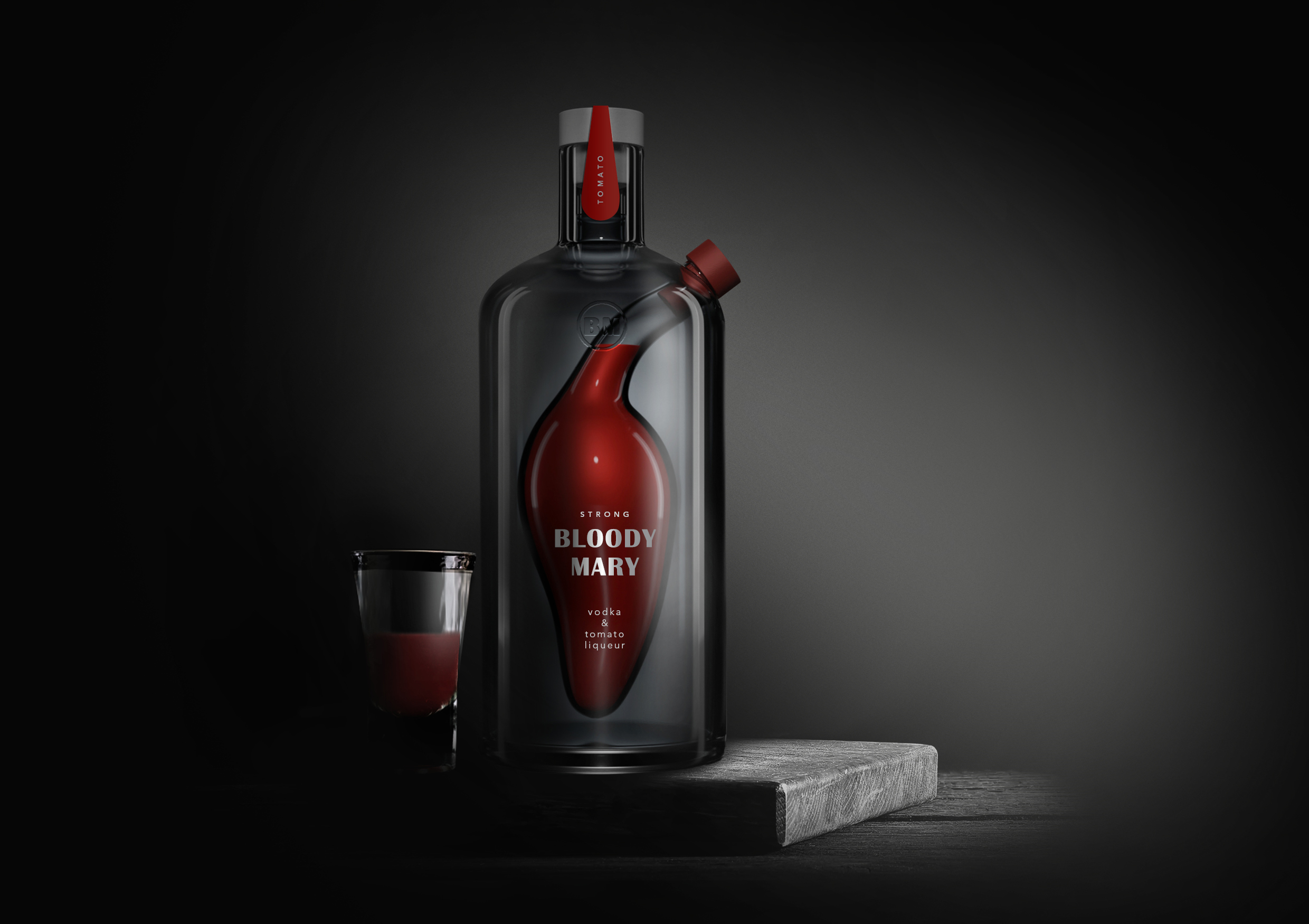 The concept of a gift package of vodka "Bloody Mary" - premium vodka is based on the cocktail "Bloody Mary", combining two drinks in one container at once. This is vodka and instead of the classic tomato juice, tomato liqueur is used, which is why the prefix "Strong" appears in the name. Two more names in a Serie - "Bloody Margot" with cherry liqueur and "Bloody Mabel" with grape liqueur.