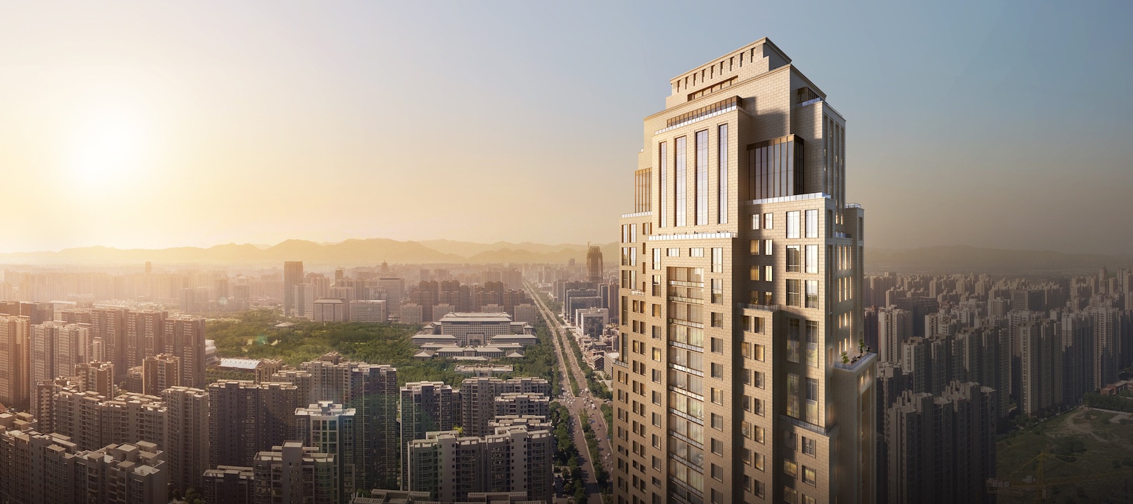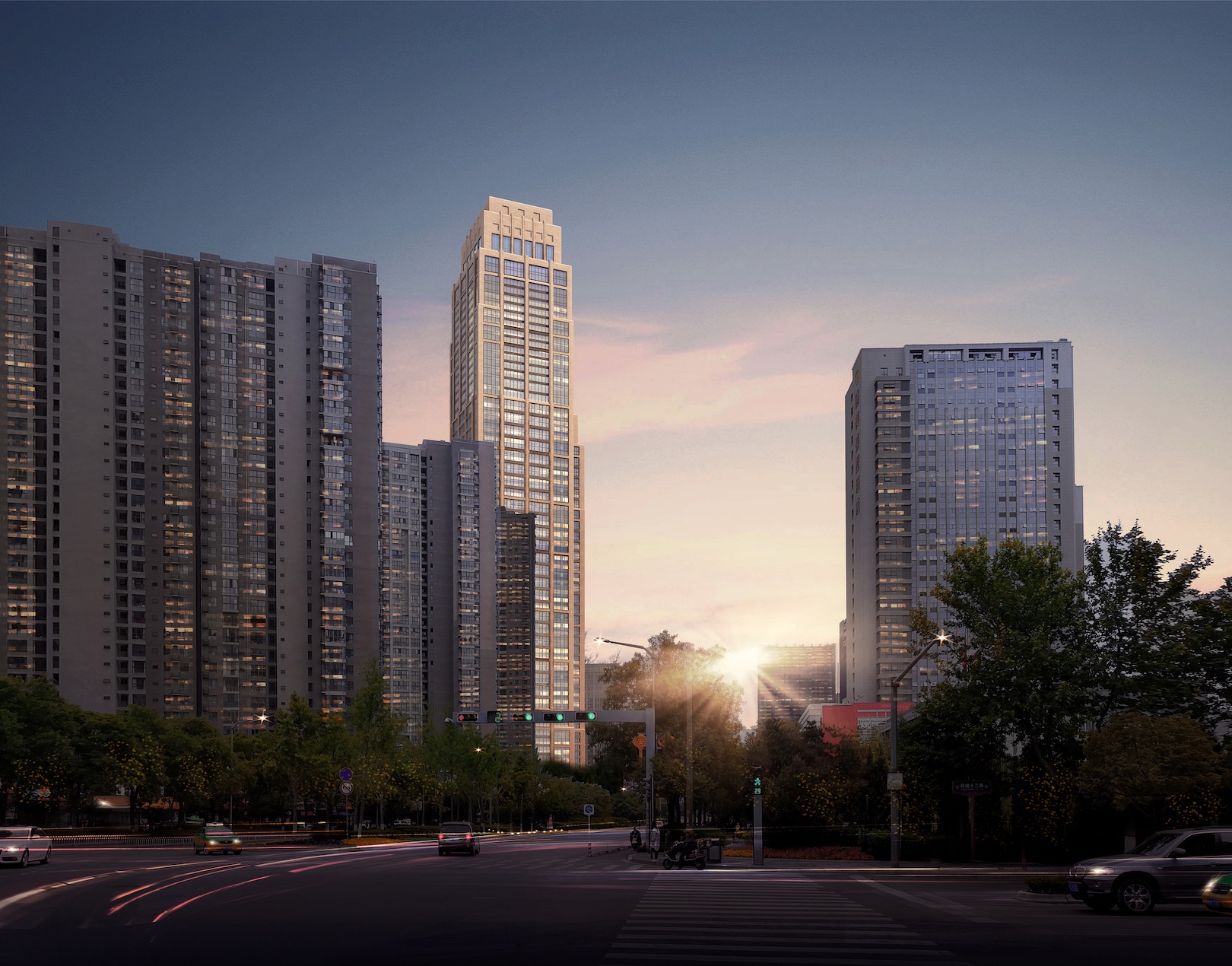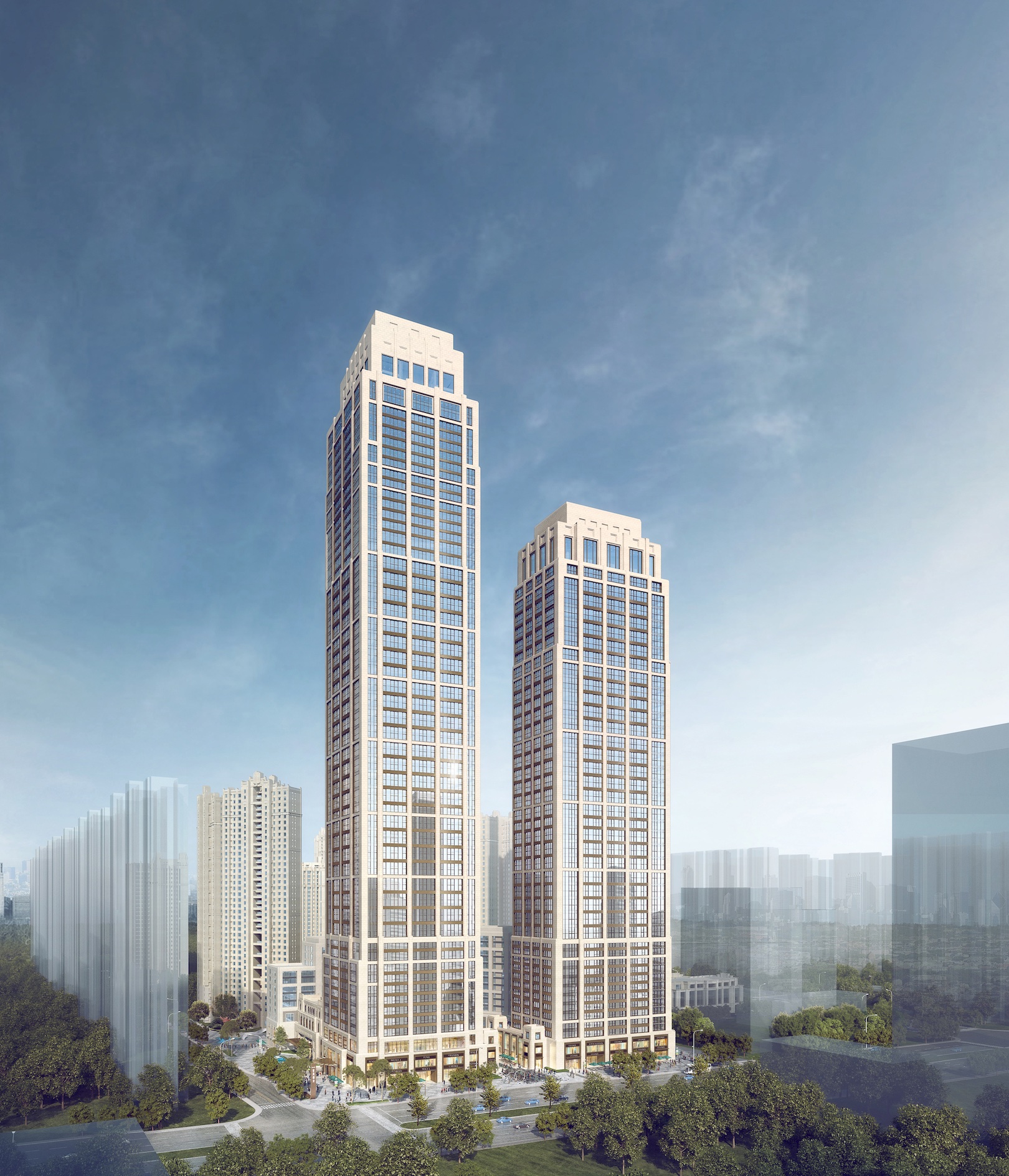 This project is located in the economic and technological development zone in northern Xi'an, as well as on the central axis of Xi'an's urban development zone. Wenjing Road on the west side is the main urban road connecting the high-speed railway station with the old version urban area. The main body of the program takes two super-high-rise towers of 270m and 220m as landmarks to show the image of the city along Wenjing Road and create a heavy and ceremonial visual corridor and urban space. The scheme style adopts the Stern metropolitan style, and the warm tone color stone on the facade and the classical shape of the layers correspond to Xi'an's urban appearance.