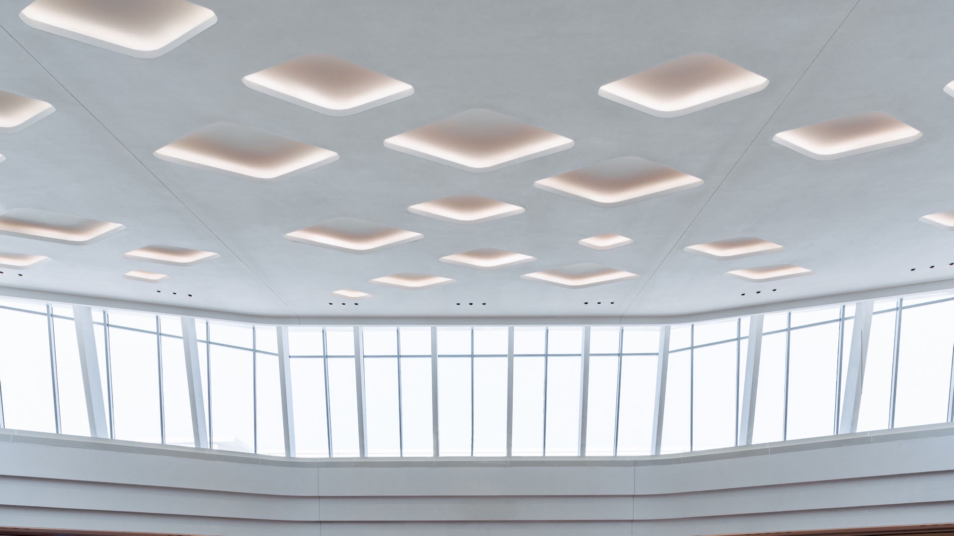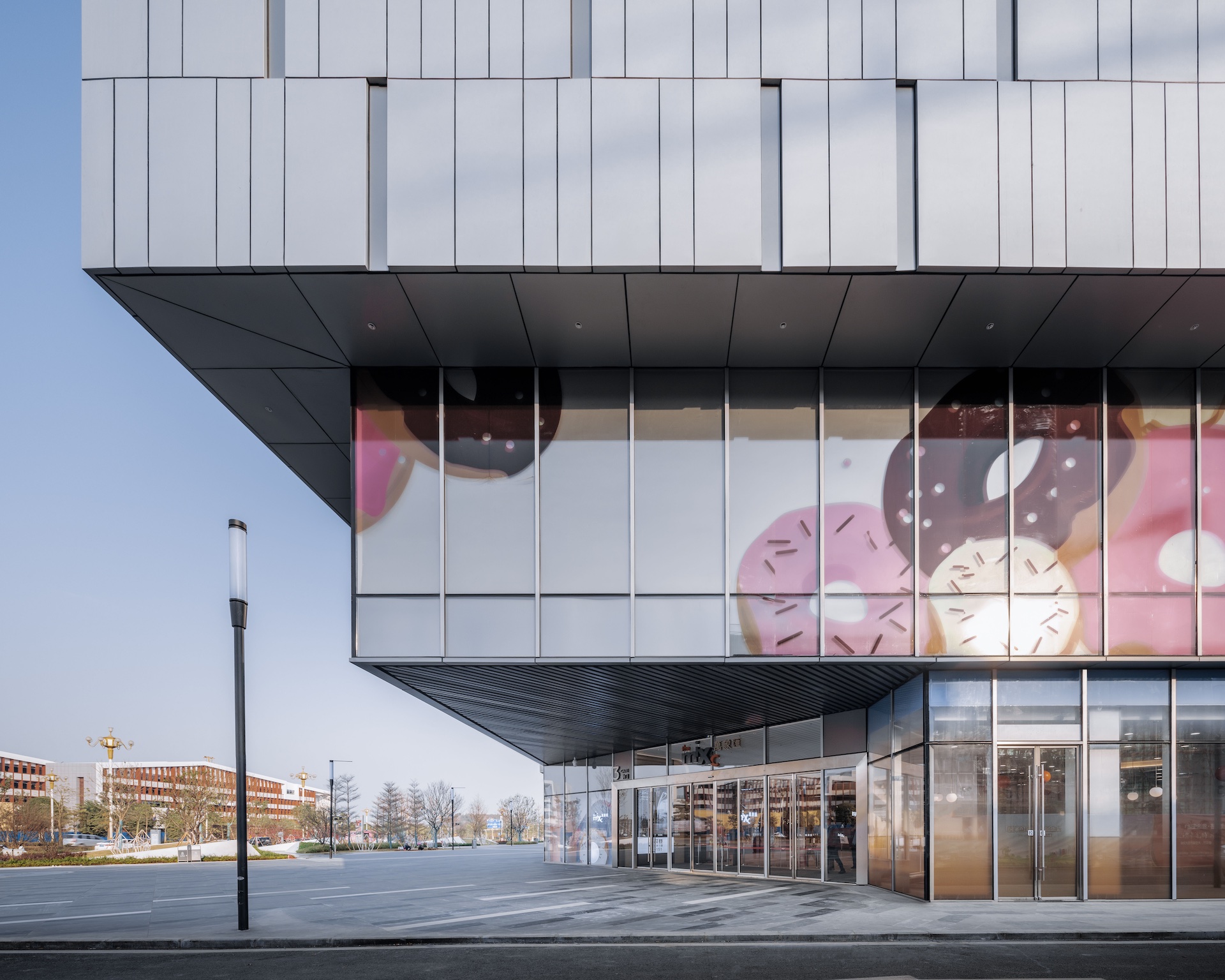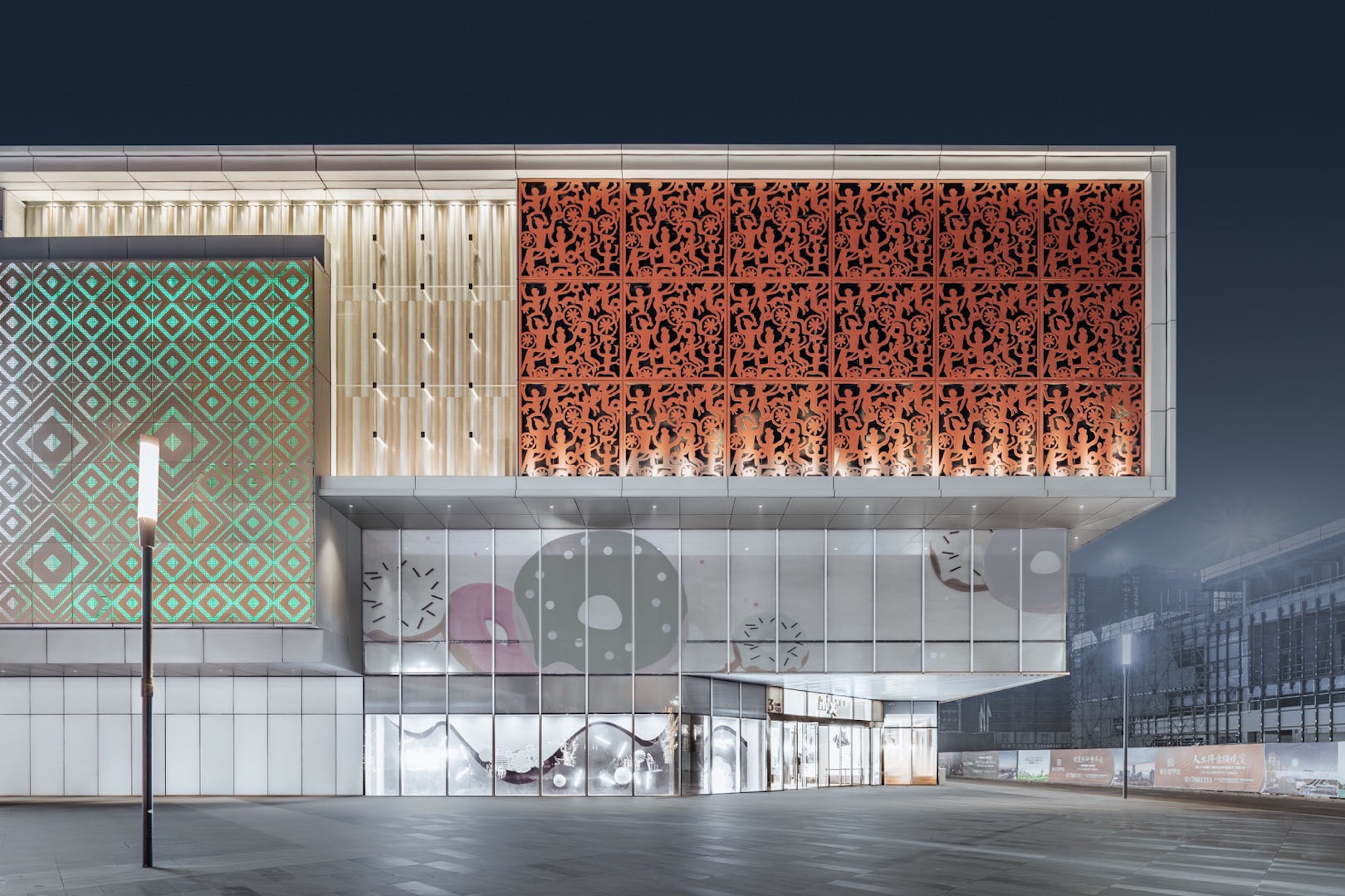 With a 200-meter-long urban interface, the project adopted the regional characteristics of brocade and re-interpreted it in a modern way, creating an humanistic pictorial façade with ethnic uniqueness. The Zhuang brocade patterns are unified and standardized. Four basic unit blocks form five different textures, combined with perforated panels for quick construction, and the light transmission of the perforated panels is used to create a rich variation of building outlook at night. The low-profile dark red weathering steel plate was chosen as the building element of the special façade to express the red texture and history of Huashan rock art.