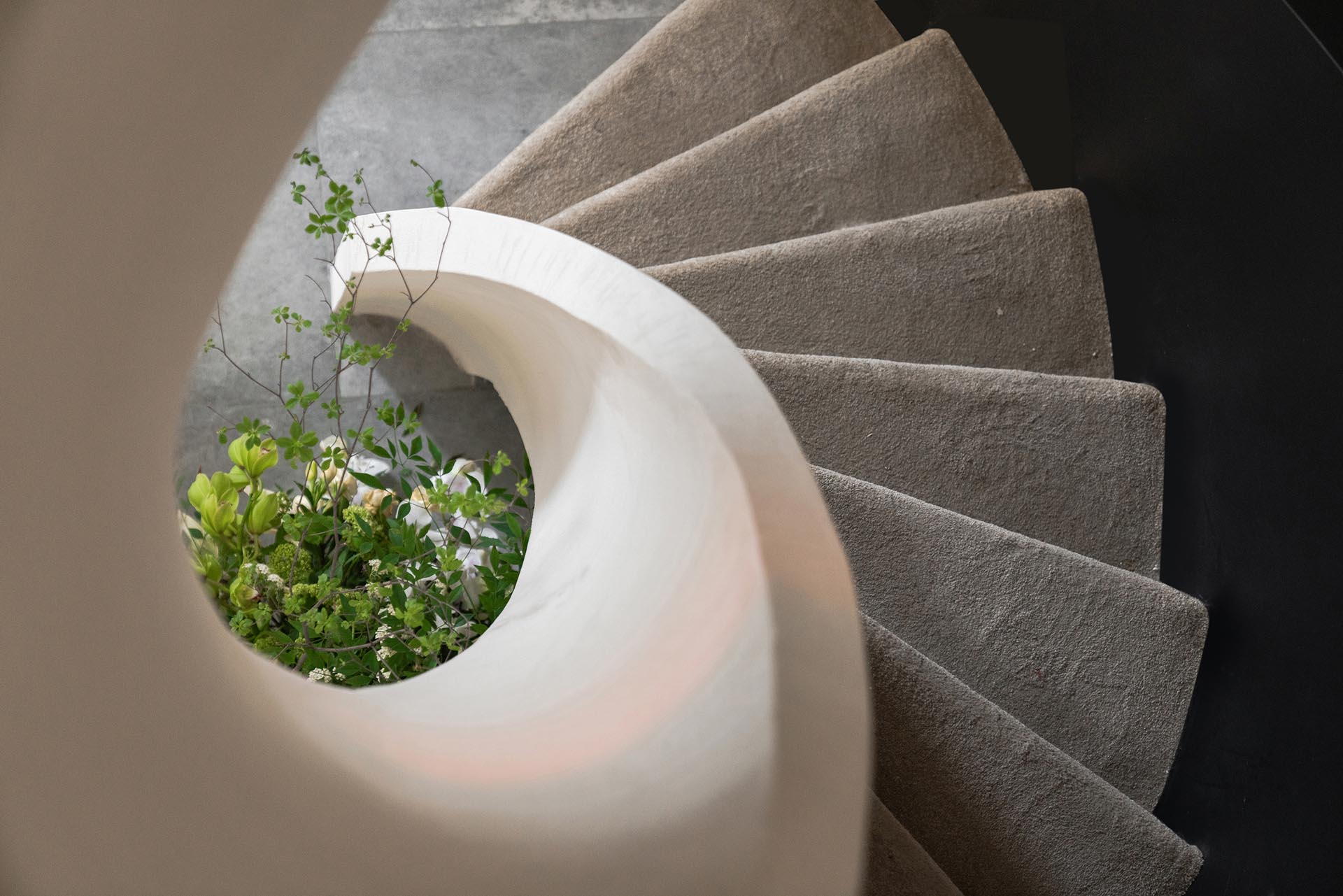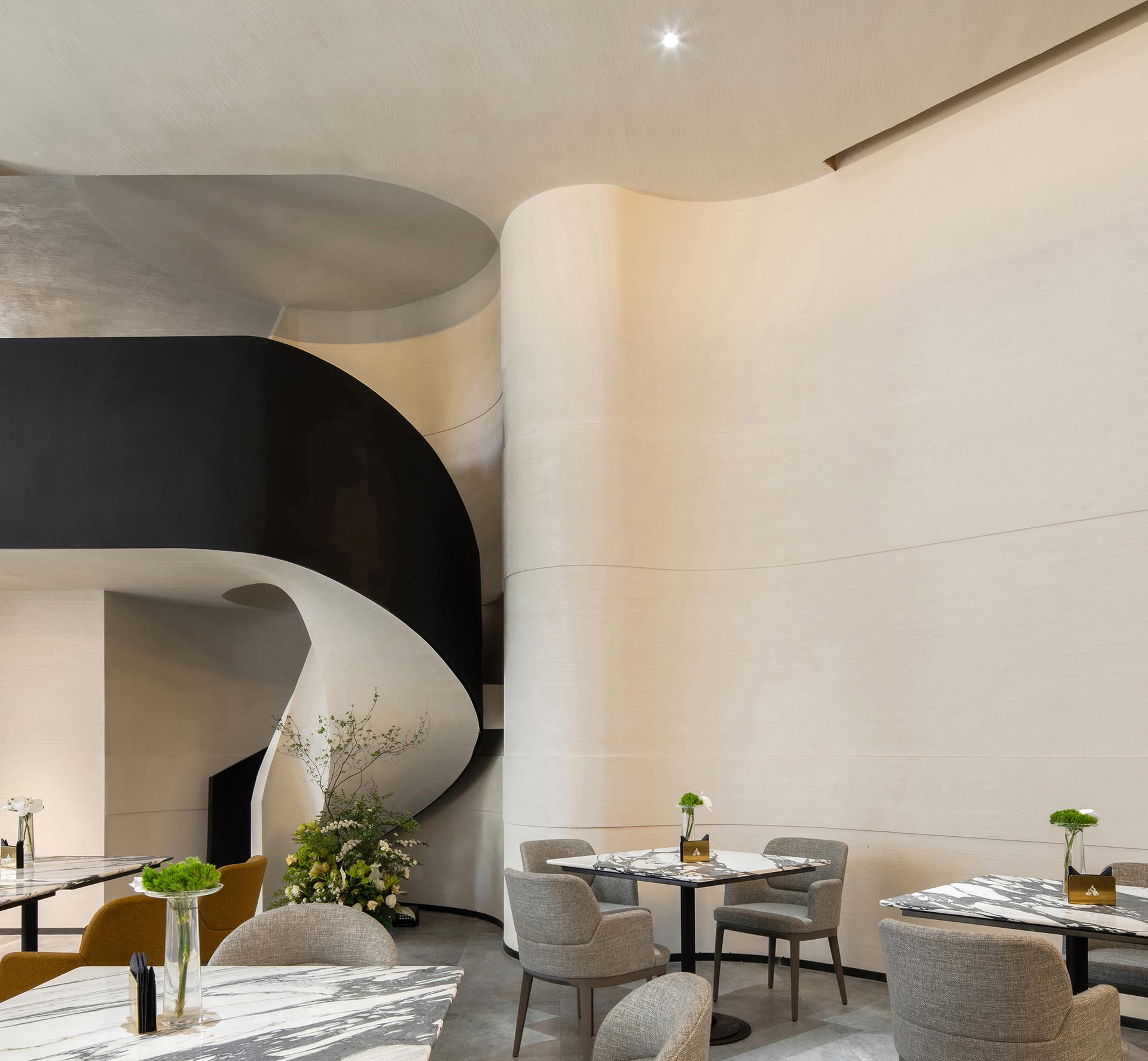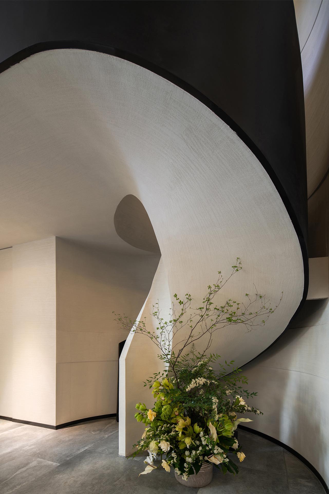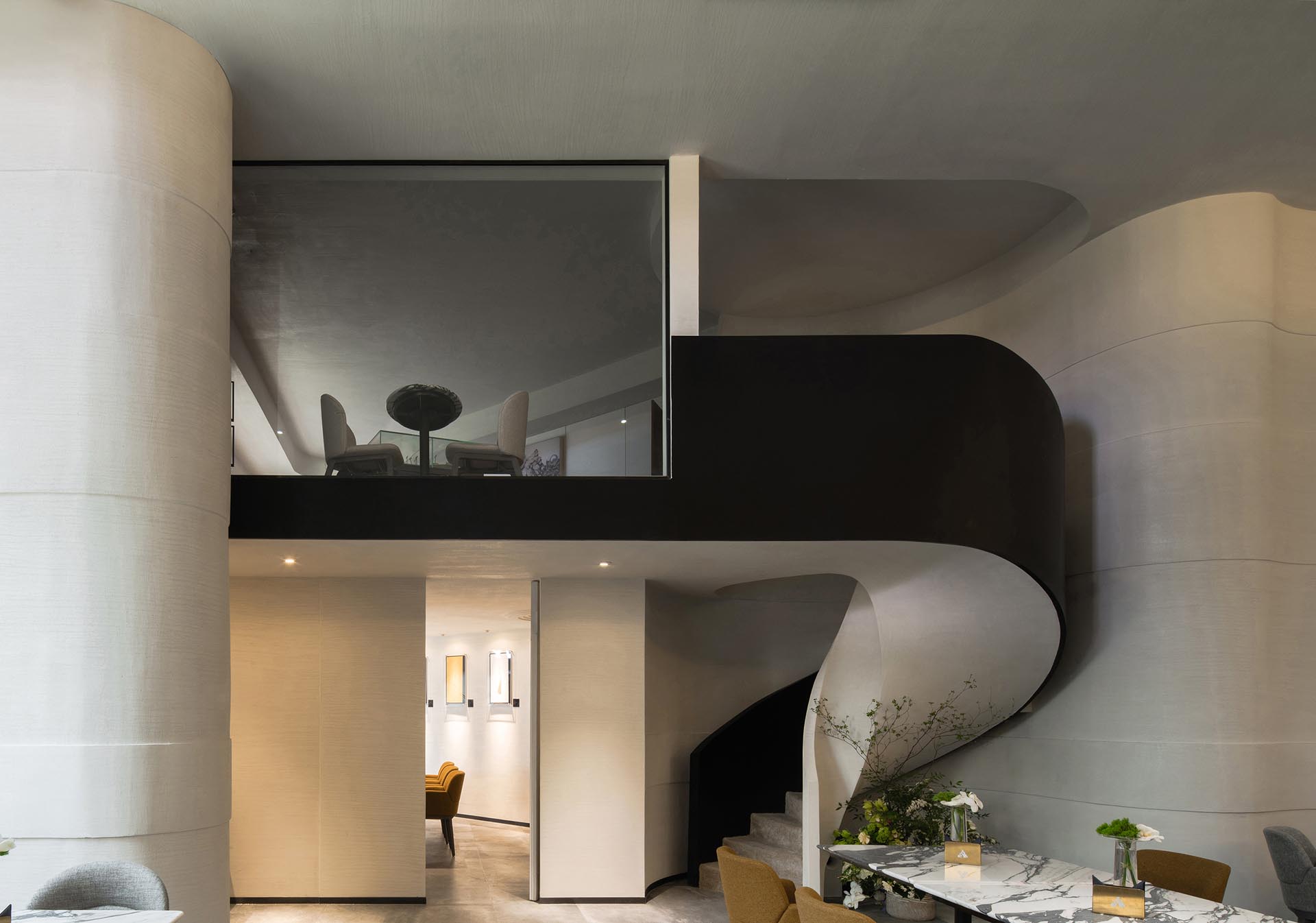 The black color is interspersed in the large area of light tone, which is like the marker highlighting the focus of the whole article, telling you where your sights should be. The space without visual center is empty and scattered, while the space with only horizontal and straight lines is monotonous and boring. Inspired by the pearl necklace, the spiral staircase is endowed with a beautiful and carefully calculated golden section curve, which connects the jewelry display area on the upper floor and the area for private afternoon-tea banquet on the first floor.