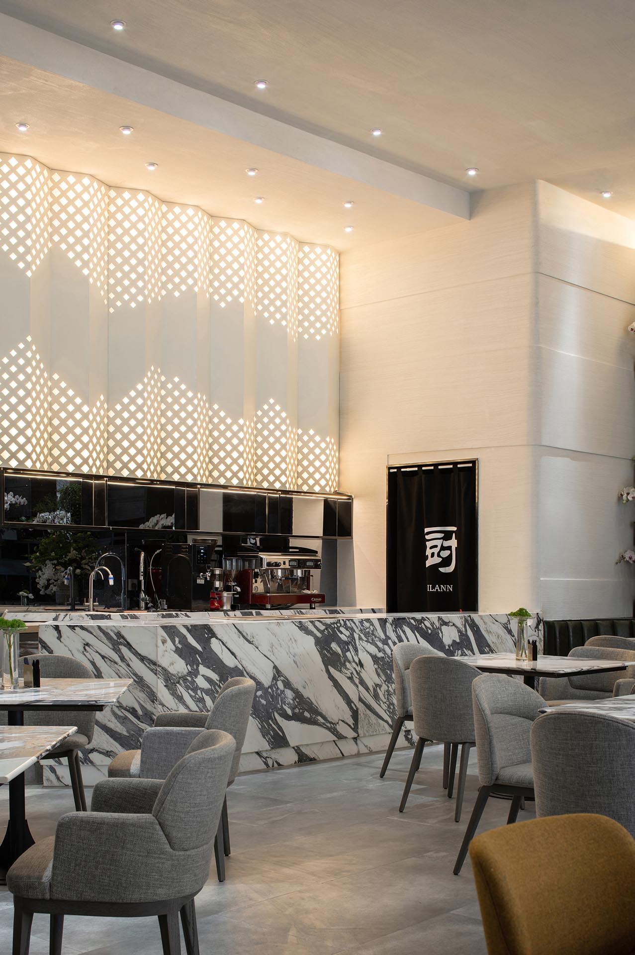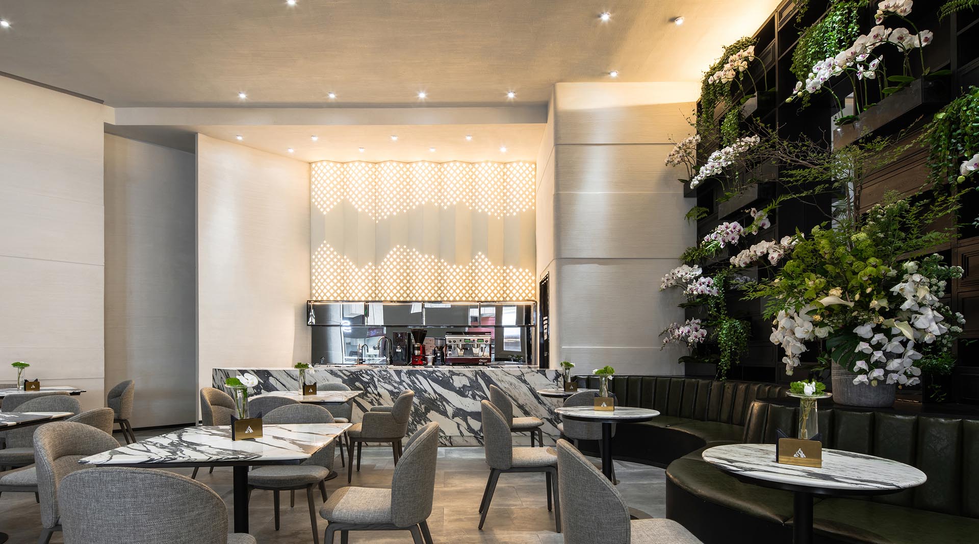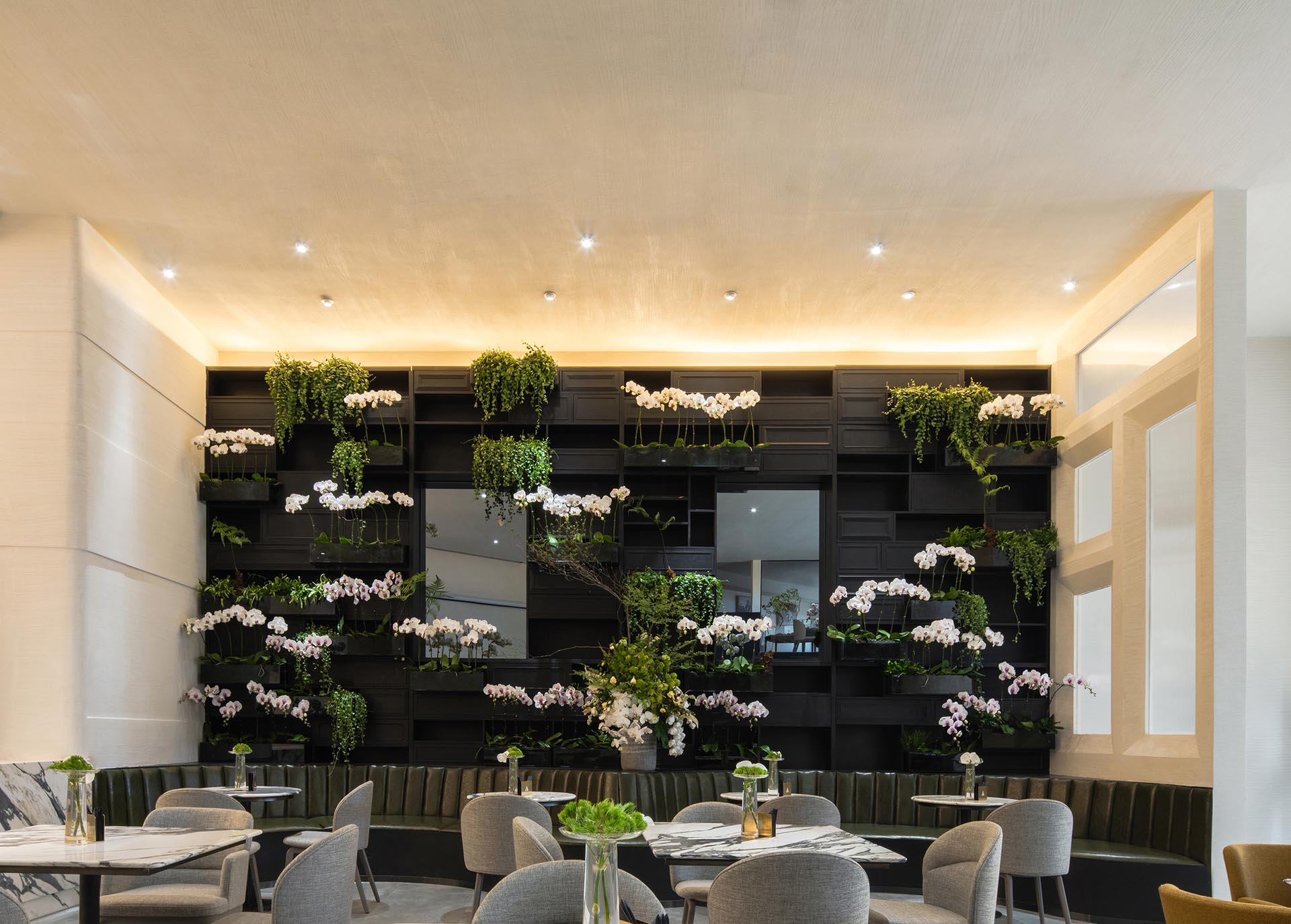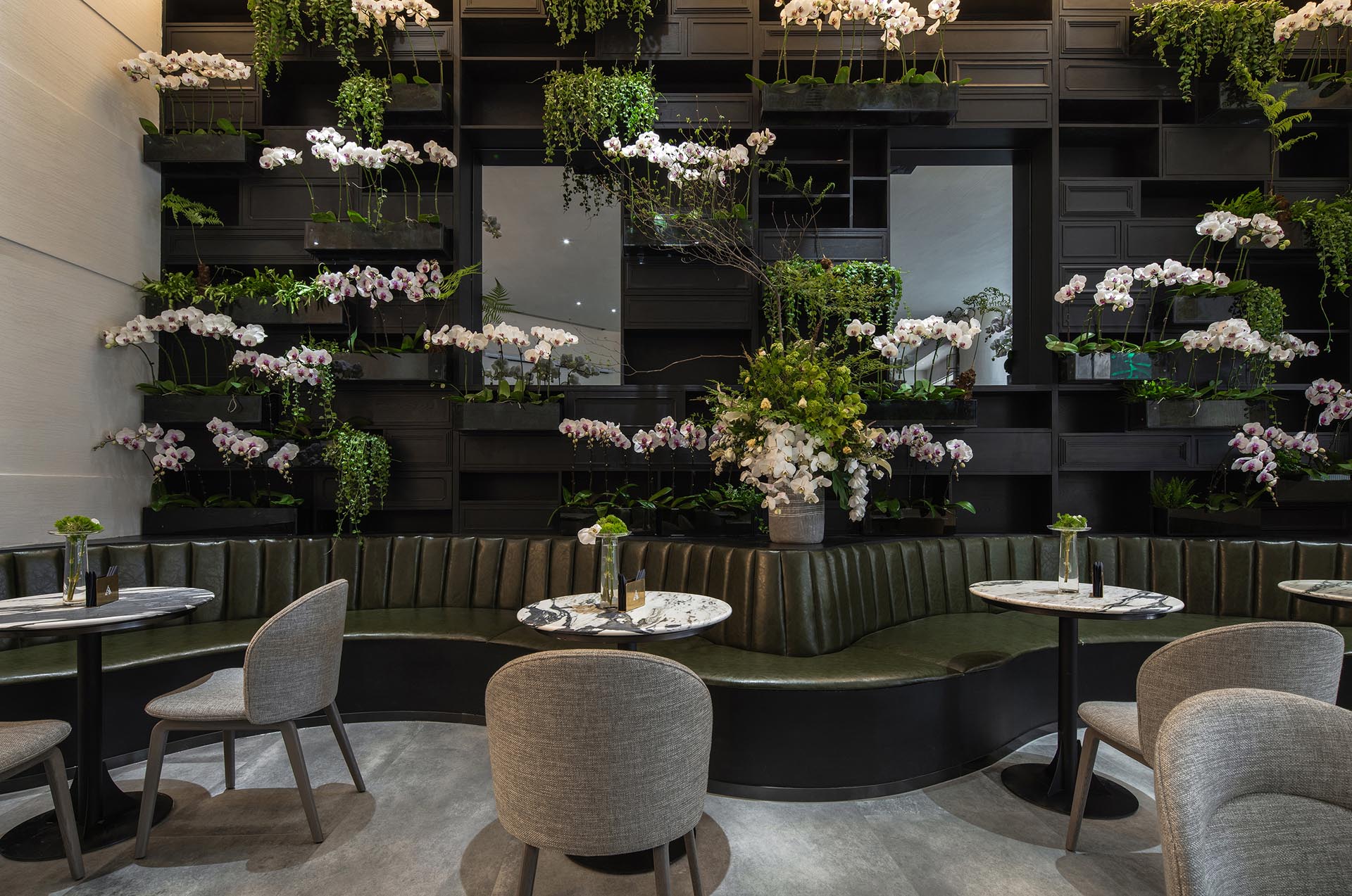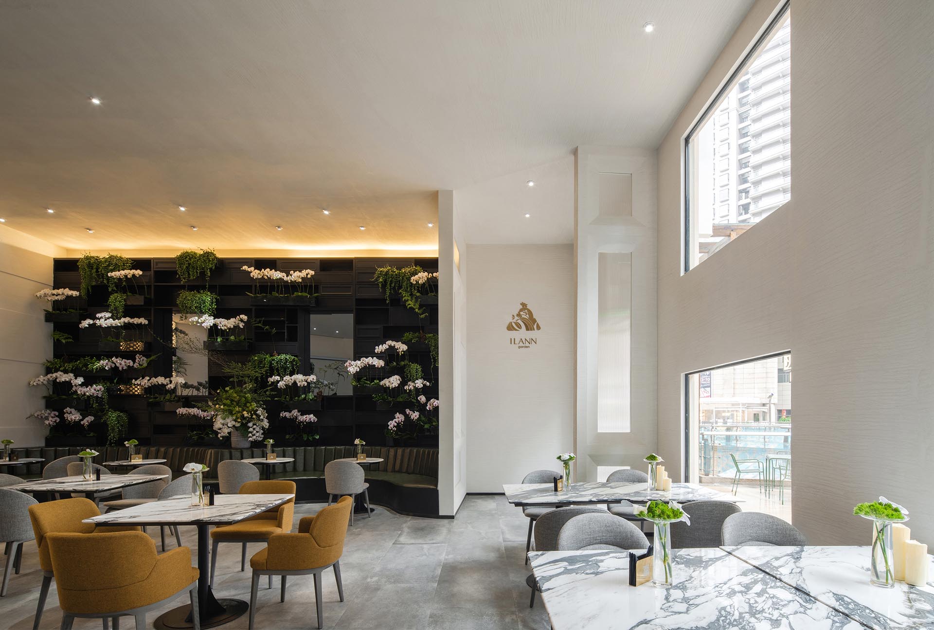 The orchid wall is the embodiment of the natural flavor and beauty in this box. The designer uses the black cabinet treated with carbon black to join the glass box to plant the orchid, so that the green can climb up the wall. The afternoon-tea time in the greenhouse echoed on the marble tabletop, waiting for the people to meet. Even the tone of the space and the appearance of the food are highly coordinated and complementary.