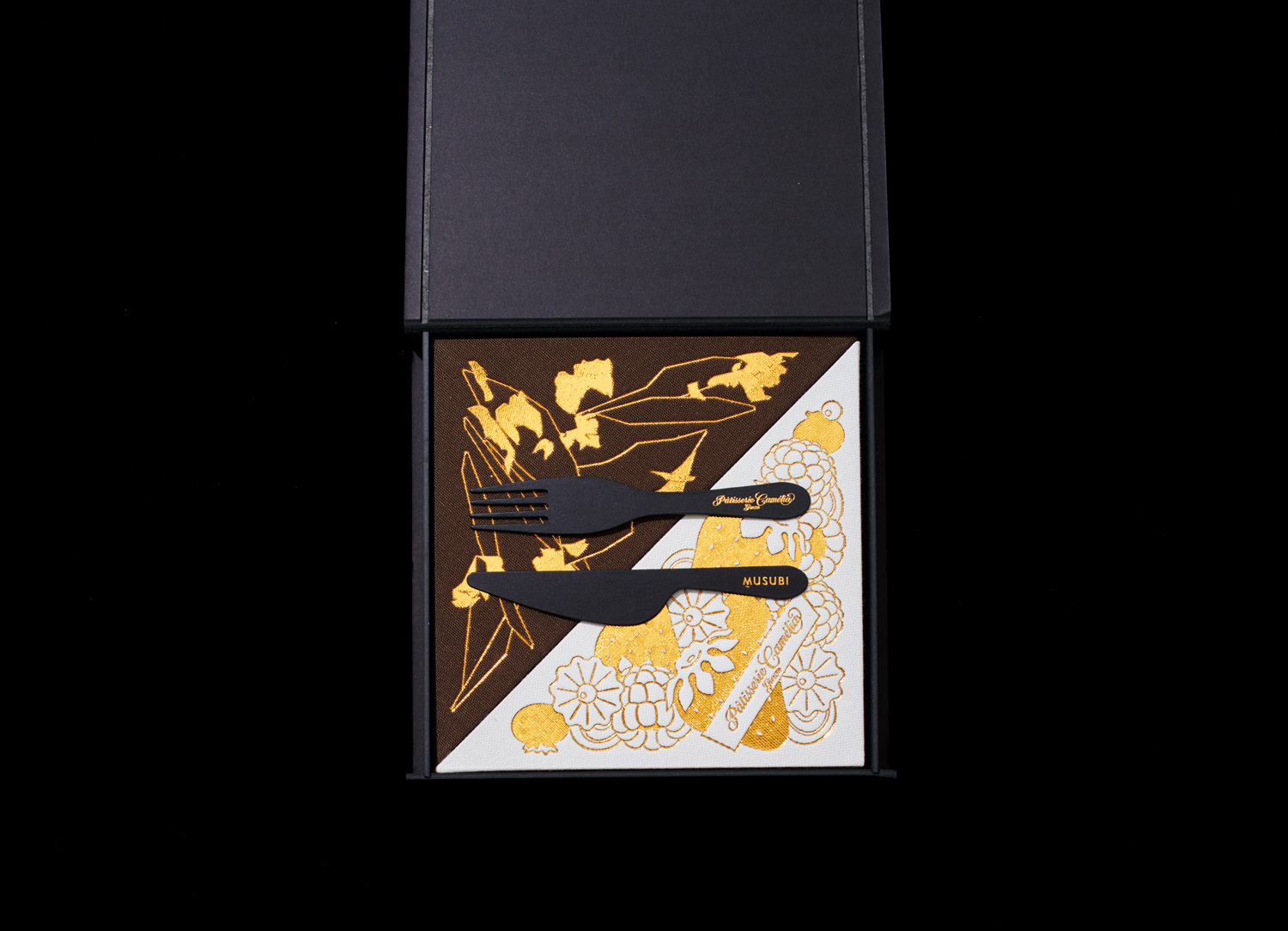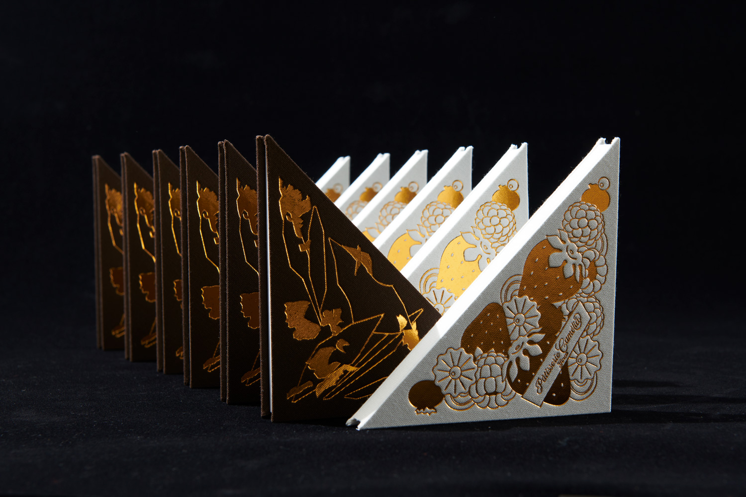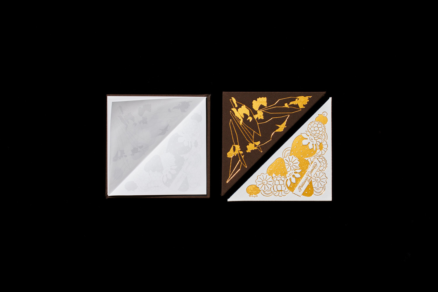 The point is that the three-dimensional effect and brilliance of the cake are expressed with gold leaf, and when the triangular notebook is opened, it becomes a square, which is an easy-to-use structure contrary to the visual impact.