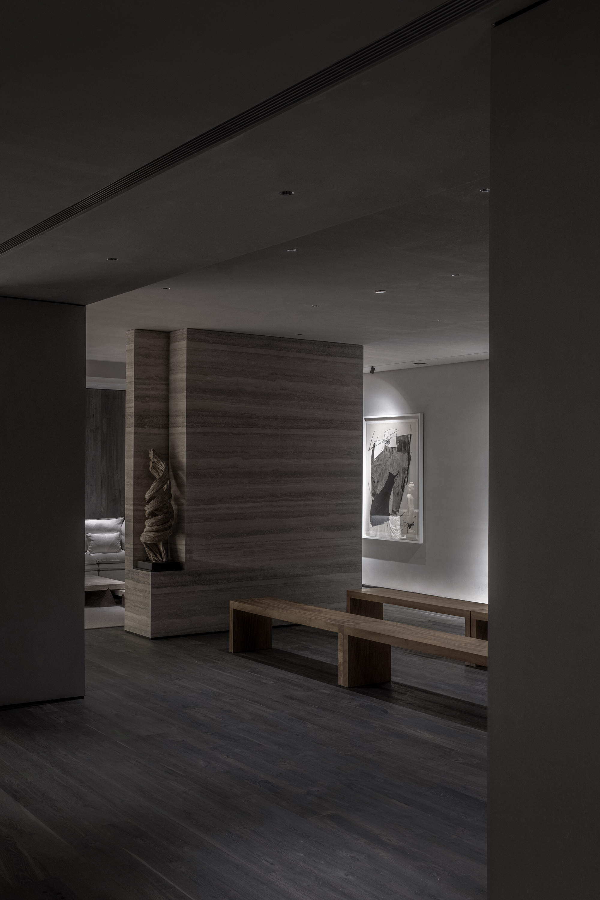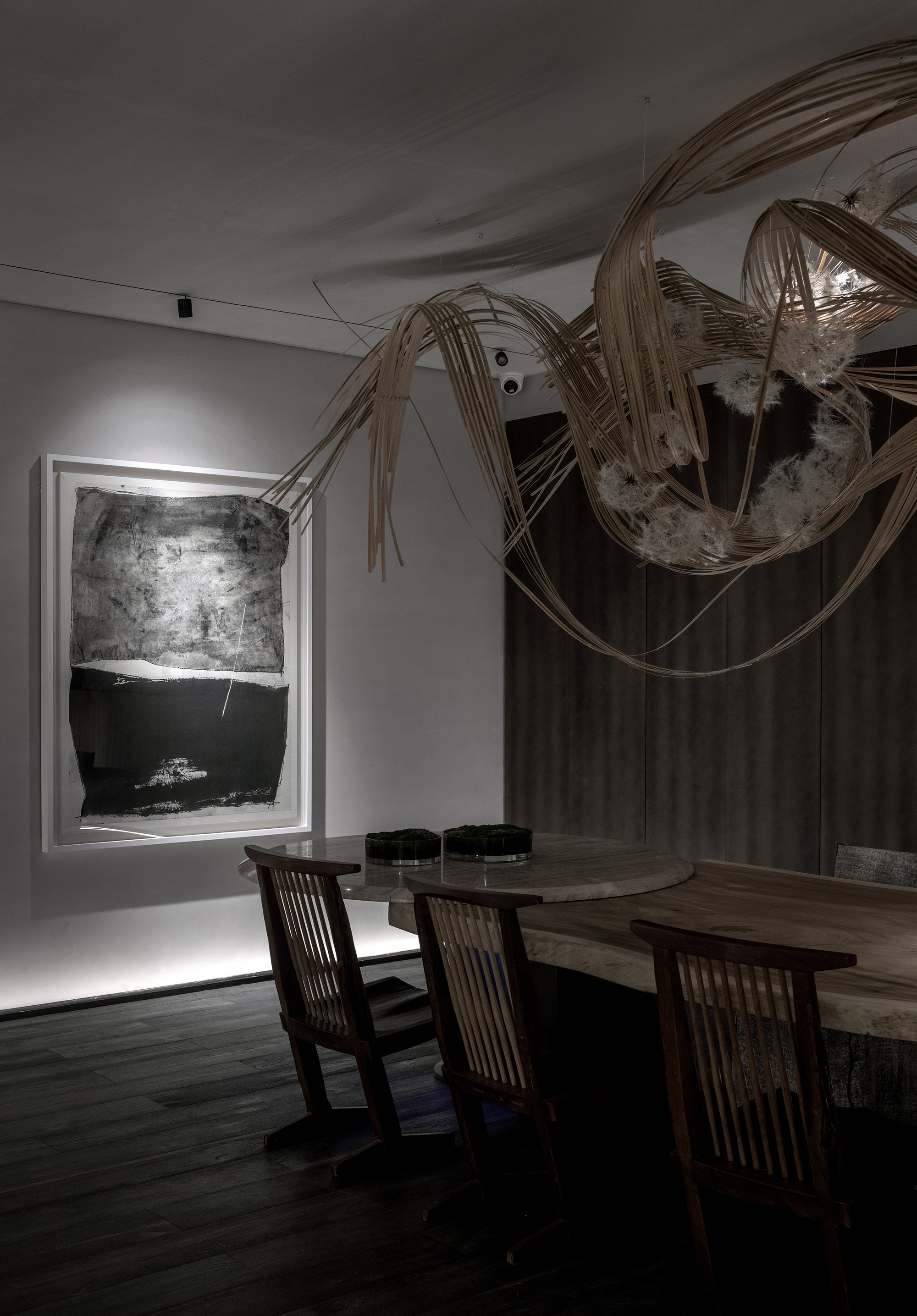The whole space is neat and concise with selective and delicate texture, which offers mildness and gentleness in the space. Through a combination of wooden material and copper imitation stainless steel, variable multilayers are created. The introduction of Chen Qi’s work Code of Nature depicts the lively aesthetics of ripples to slow down the pace of the surroundings. Focusing on the expression of natural elements, the bonsai application establishes a sense of oriental garden. Wooden flooring, marble table, and the plants used all compose an one and only landscape inside.