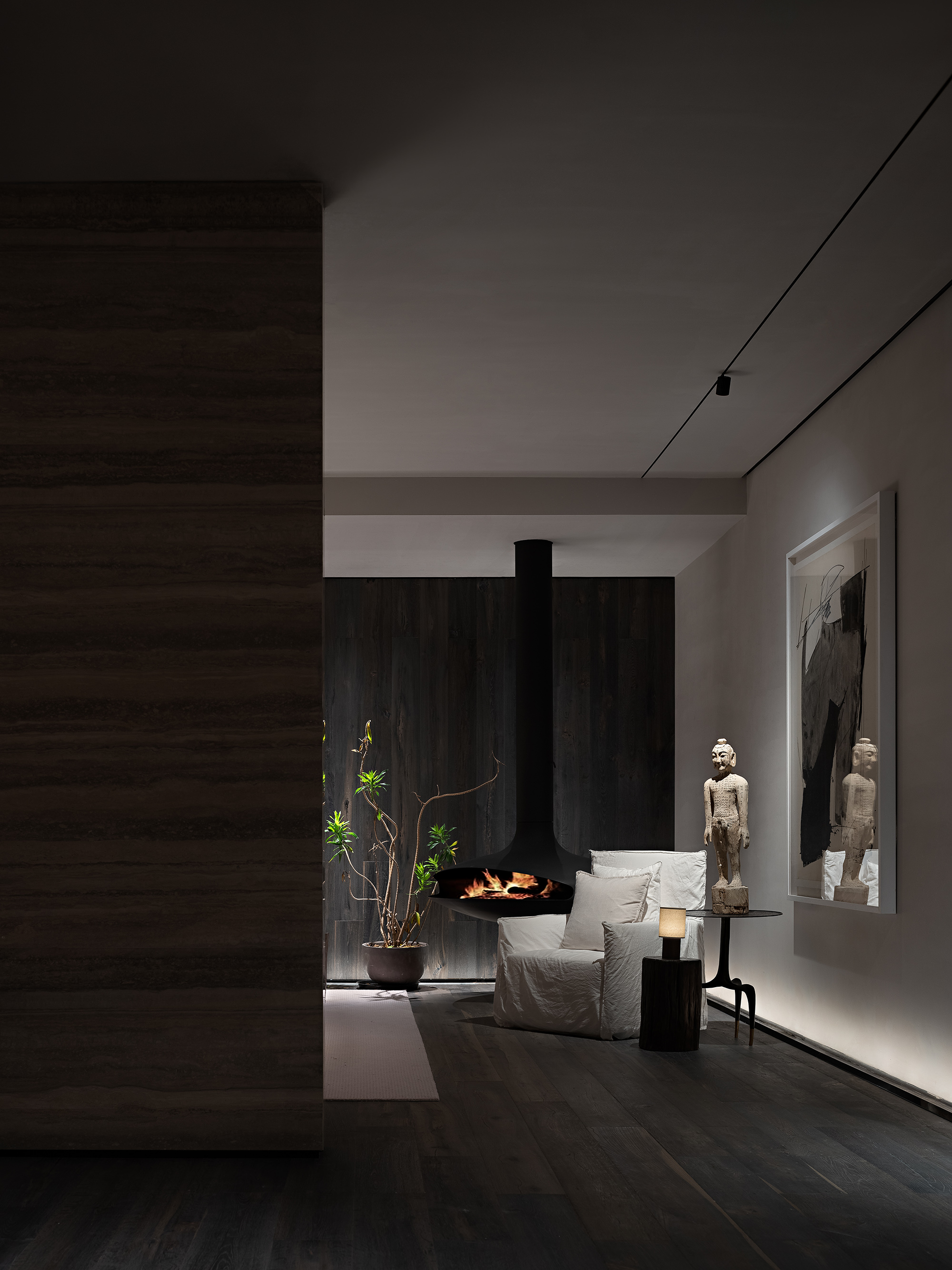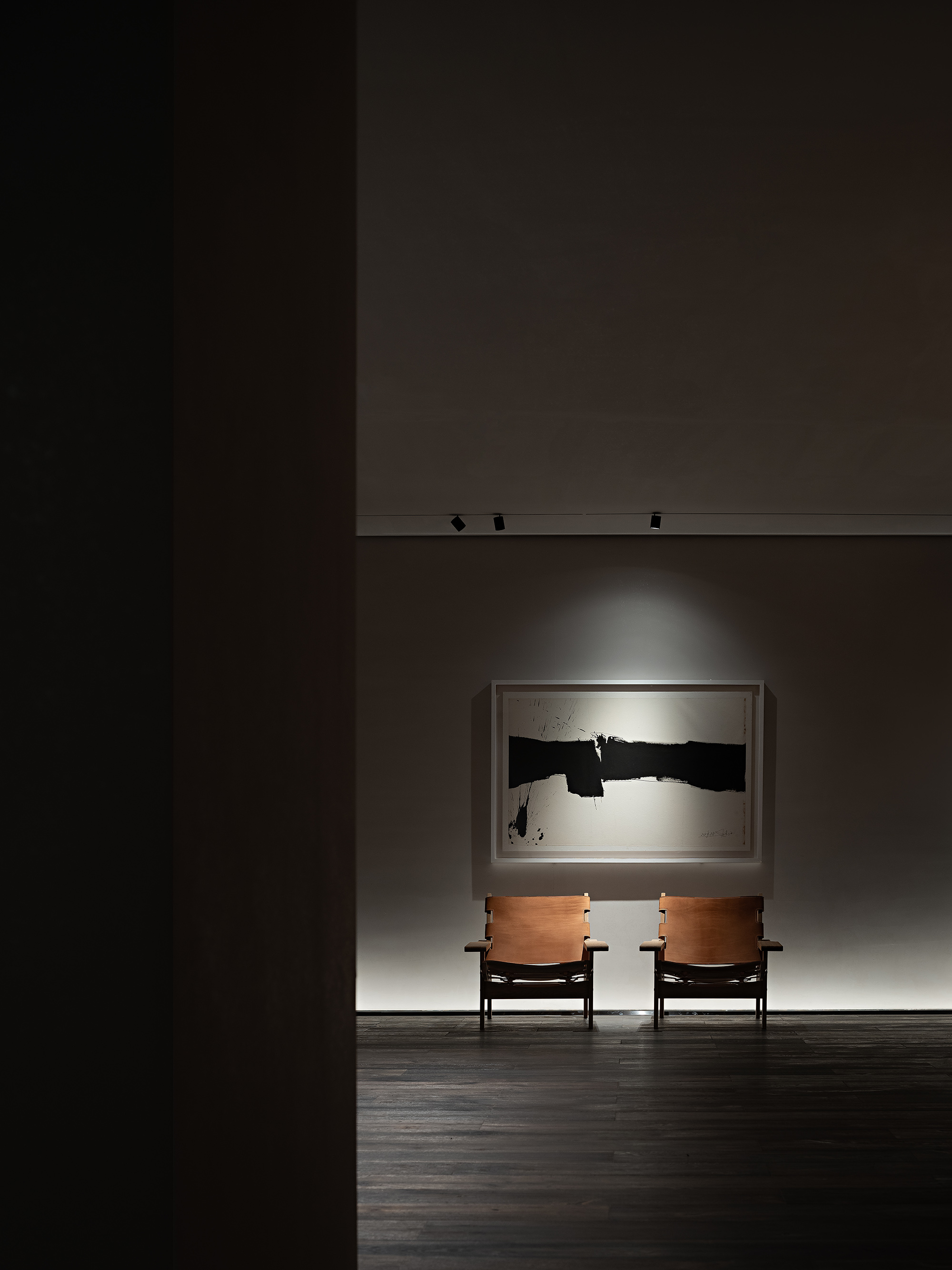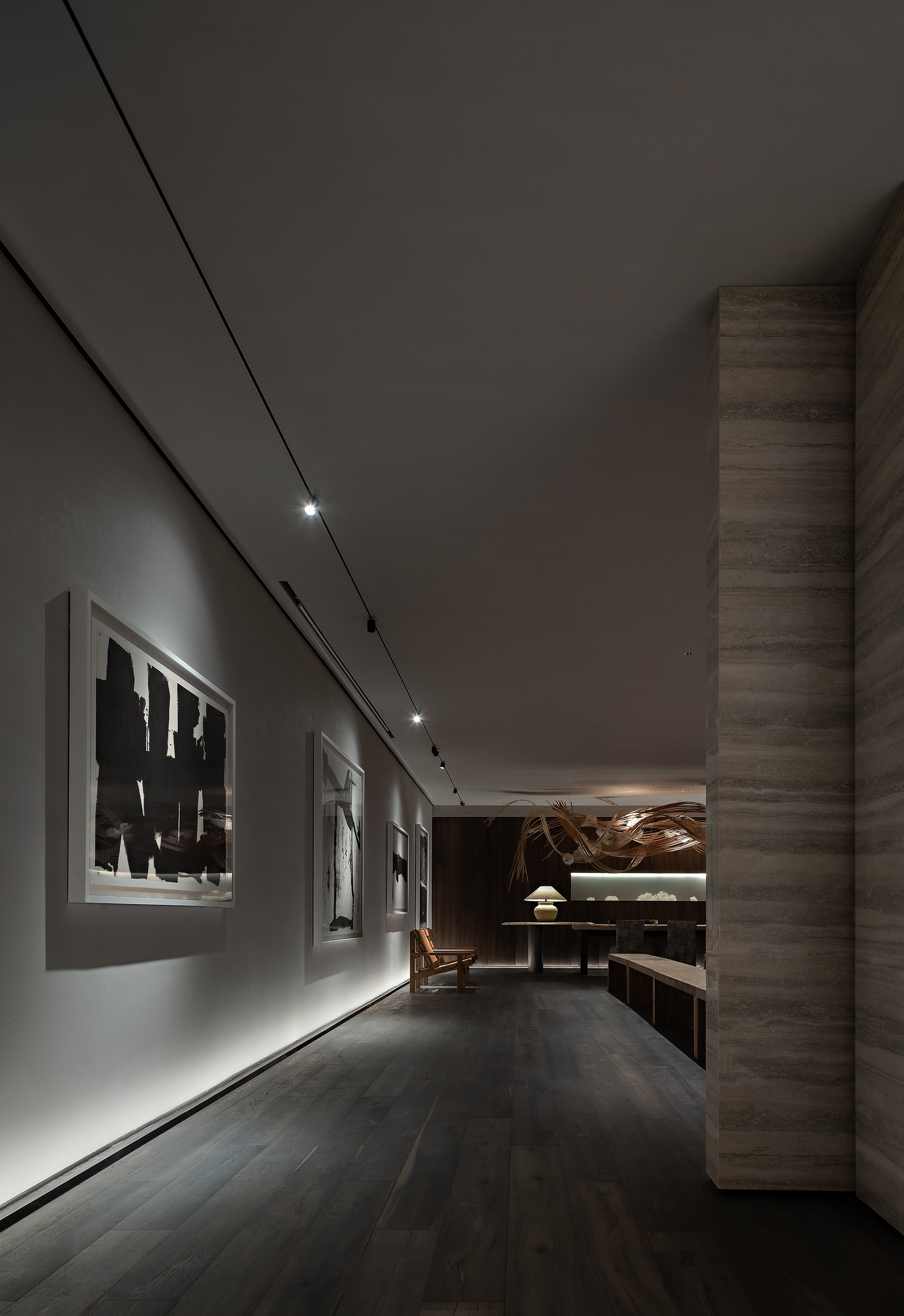 Calligrapher Yang Xiaojian is an innovator in modern Chinese calligraphy. His bold application of Western abstract expressionism gives a new life to traditional Chinese calligraphy. The ink and wash elements of his novelty echo perfectly with the minimalist interior style. The charm of Zen is expanded through integration of lighting and variable substances. Between bulkiness and lightness, one can take a seat for a sip, enjoying the Zen atmosphere under exquisite lighting design.