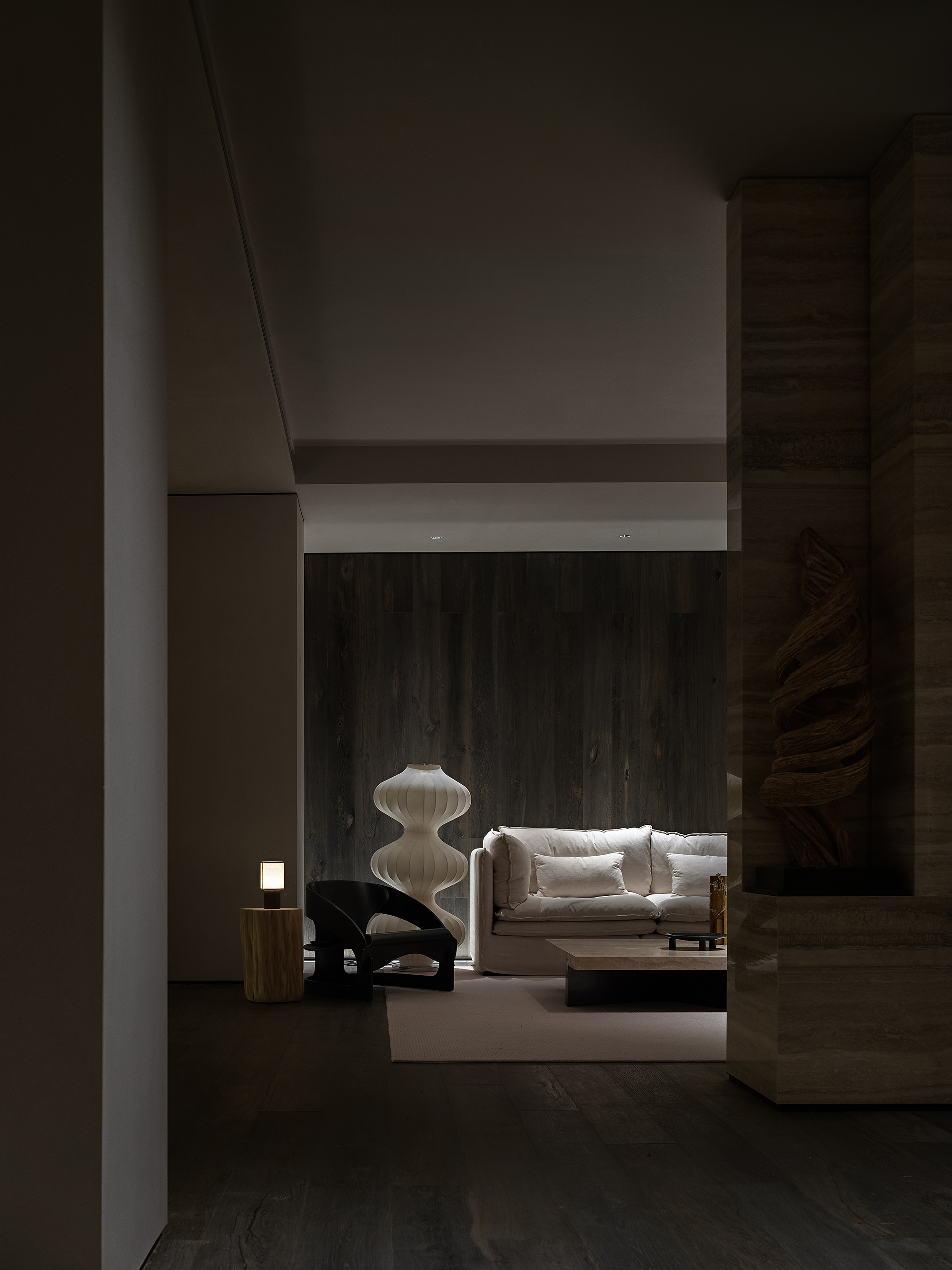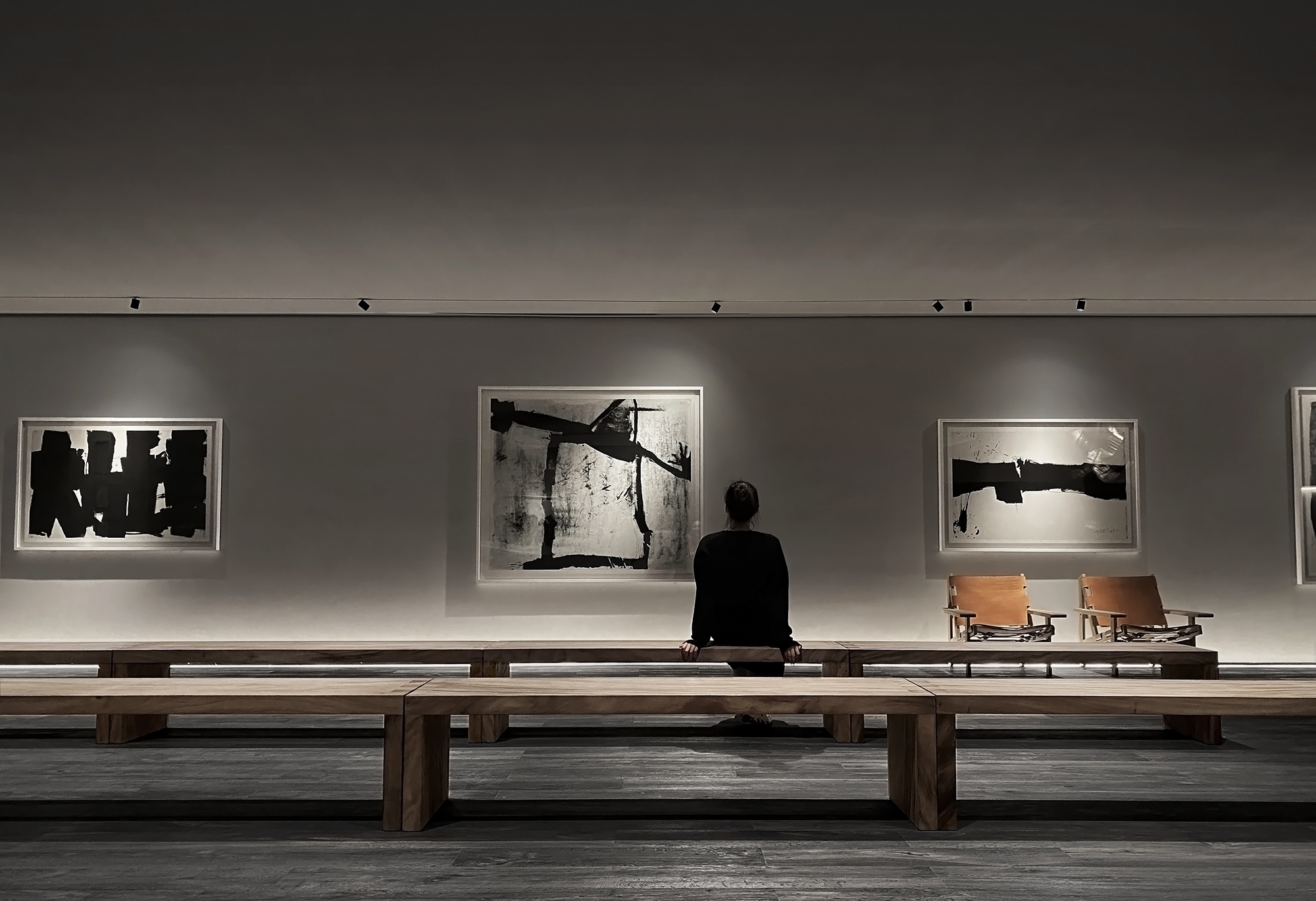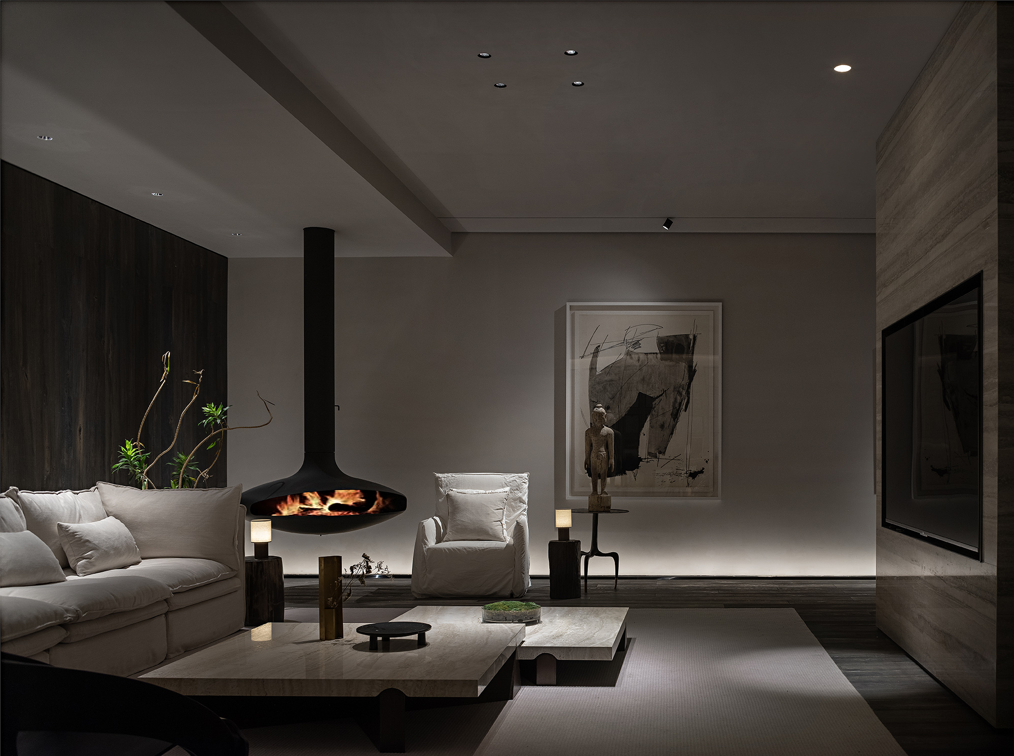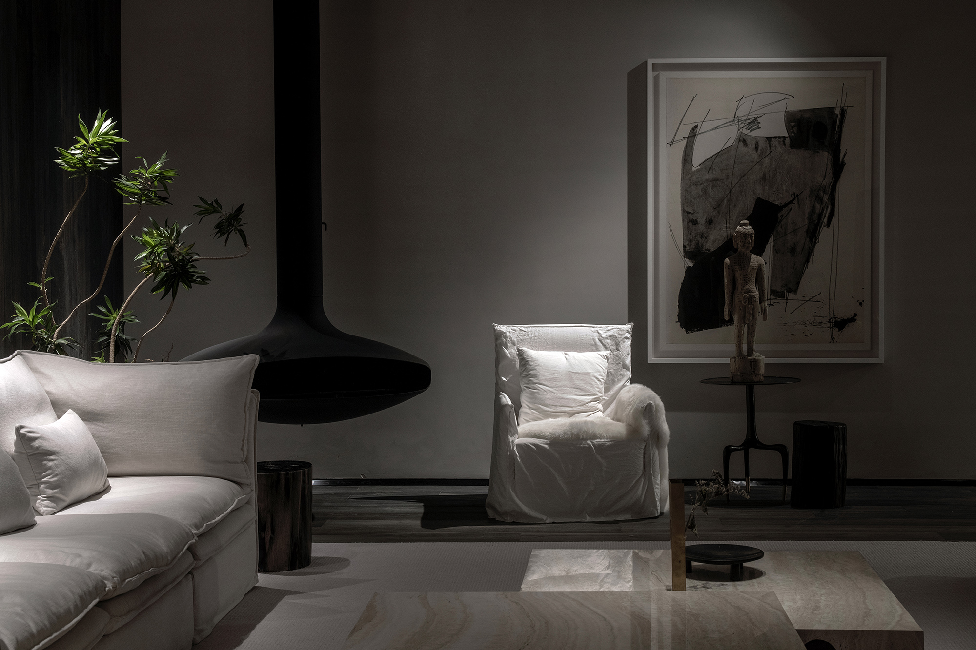 Calligrapher Yang Xiaojian is an innovator in modern Chinese calligraphy. His bold application of Western abstract expressionism gives a new life to traditional Chinese calligraphy. The ink and wash elements of his novelty echo perfectly with the minimalist interior style. The charm of Zen is expanded through integration of lighting and variable substances. Between bulkiness and lightness, one can take a seat for a sip, enjoying the Zen atmosphere under exquisite lighting design.
